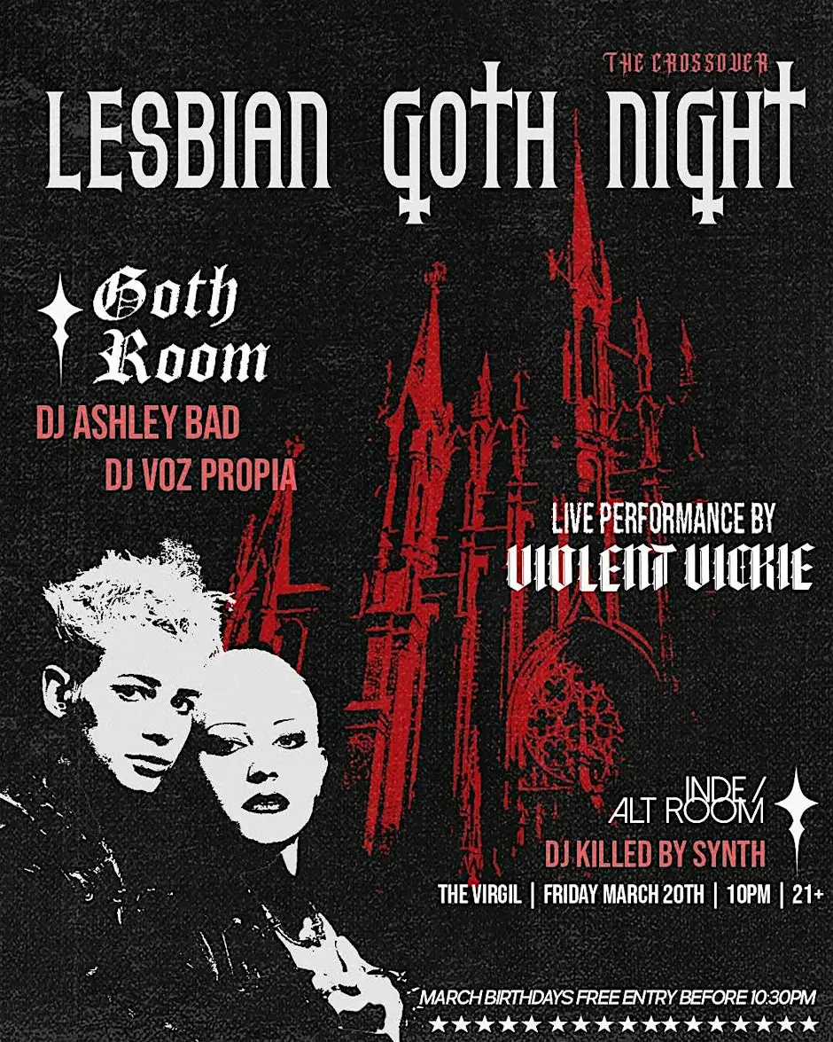 Join us for our third THE CROSSOVER: GOTH vs. INDIE-ALT Friday, March 20th at The Virgil in Silver Lake, CA | 10PM | 21+ Live performance by darkwave / synth-pop artist Violent Vickie. Introducing sapphic baddie to the LGN fam: DJ KILLED BY SYNTH spinning your favorite indie sleaze + alt all night in Room 2. Calling all Pieces and Aries, free entry for March birthdays before 10:30PM (Show ID at the door) GOTH ROOM | Resident DJs Ashley Bad + Voz Propia Trad Goth • Darkwave • EBM • New Wave Two rooms. Goth vs. Indie-Alt.