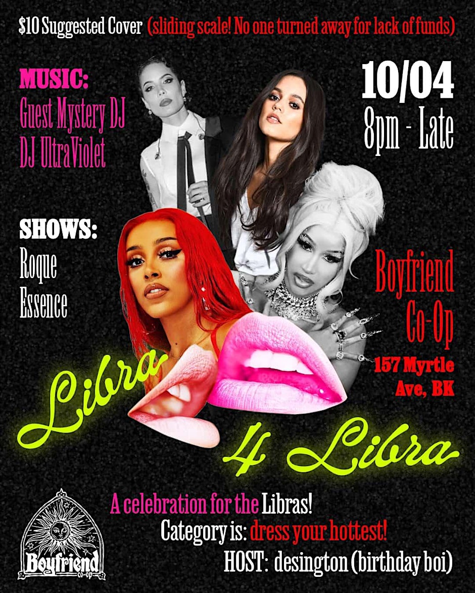 Libraaaaas rise up!!! Calling all Libras (Sun, moon, rising!) - it’s time to SHINE, bbs! Pull up to the first Libra 4 Libra, a party for Libras and those who love them. SATURDAY Oct 4th| 8 pm - LATE!!! @boyfriend We have a mystery guest DJ starting out the evening and then DJ Ultraviolet to send us off into night! Shows by some of the hottest drag queens in the city~ Essence and Roque for the Libras (bring dollars to tip your queens ) The host (Desington) *is* celebrating their 35th year around the sun, so pull up ready to shake ass!!
