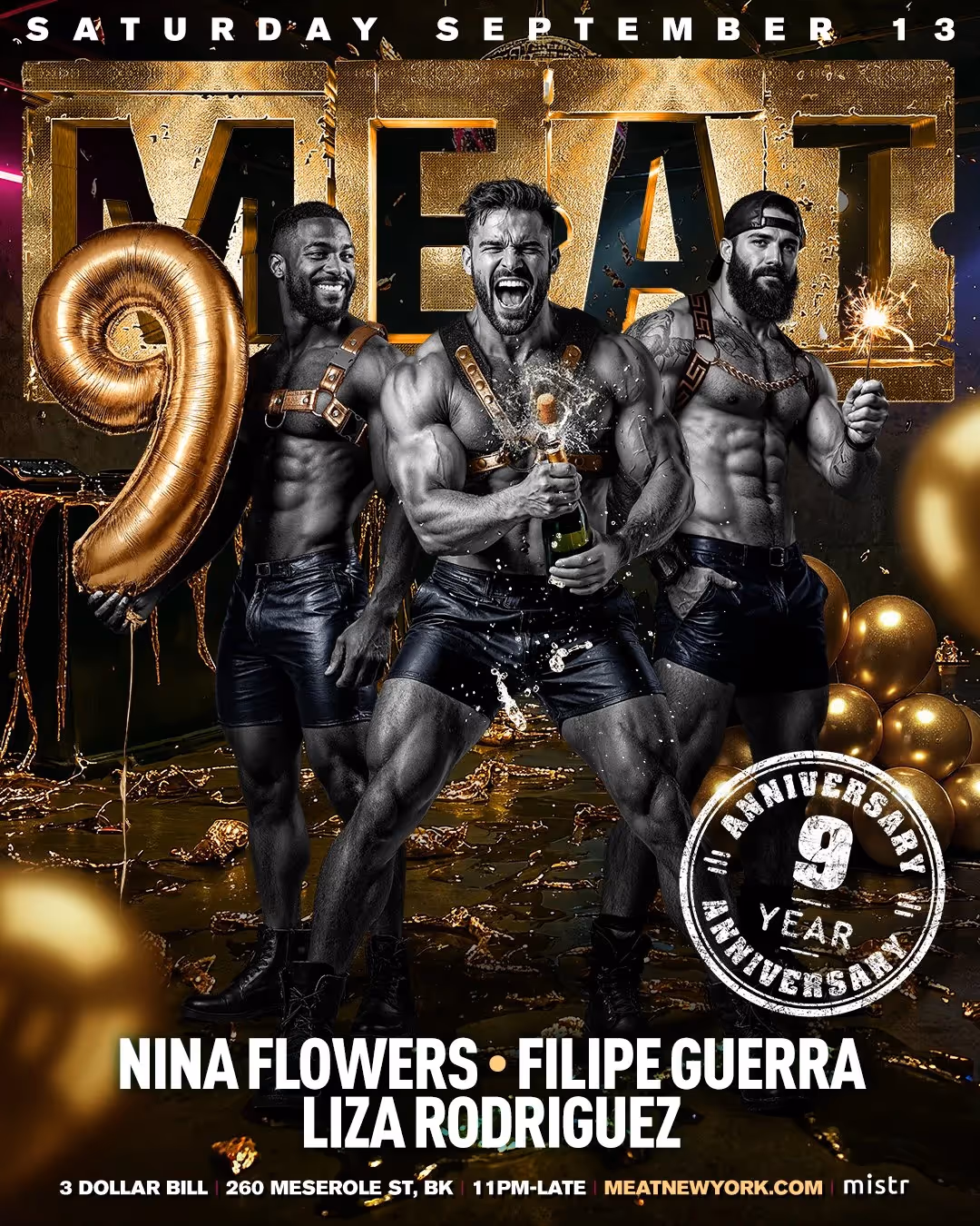 Get ready to celebrate M.E.A.T.'s 9th year anniversary! Break free at NYC’s sexiest party! Unleash your deepest desires and get ready to get down as we welcome power house DJ's NINA FLOWERS, FILIPE GUERRA & LIZA RODRIGUEZ! VIP includes Express Entry to Skip the Line, Exclusive VIP Darkroom, and treats on us!