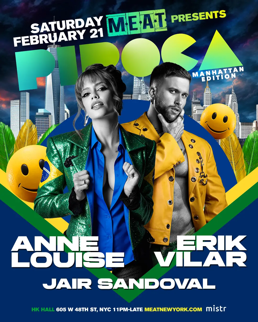 BRAZIL'S ICONIC PARTY RETURNS: PIPOCA! Get ready for a night bursting with color, rhythm, and pure energy as we bring the spirit of Brazil straight to the dance floor. Featuring Brazilian superstar headliners ANNE LOUISE and ERIK VILAR, with a supporting performance by JAIR SANDOVAL. Expect high-energy performances, dancers, and nonstop beats that will keep you moving all night long.