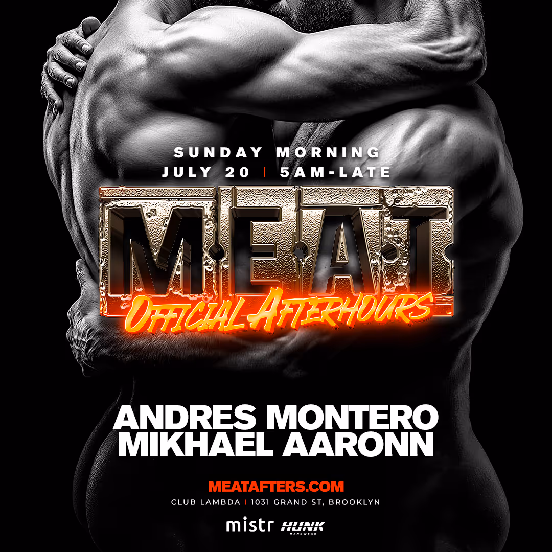 Sunday Morning: Right after M.E.A.T. BLACKOUT EDITION – Join us for M.E.A.T. Official After-Hours for your early morning addiction to the dance floor! With the sexiest beats by ANDRES MONTERO + MIKHAEL AARONN! The drums, bass and boys are all happening just minutes away from the main party. Keep your Saturday Night going (or start your morning!!) at 5am with one of NYC’s sexiest parties and save by getting your pre-sale ticket NOW.