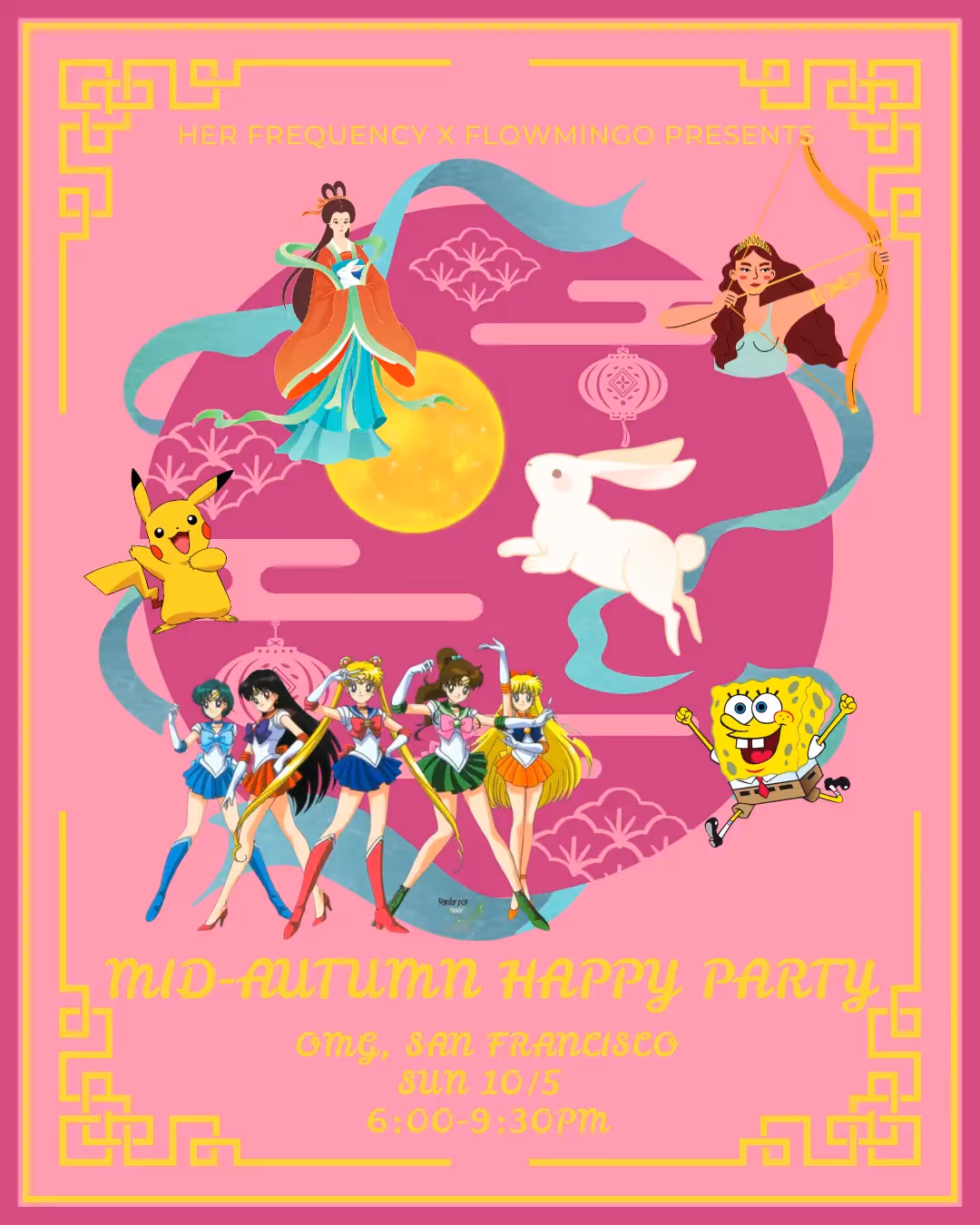 The Mid-Autumn Festival, as significant as the Spring Festival in Chinese culture, began as a harvest ritual to honor the moon. On the 15th day of the 8th Chinese lunar month, the moon shines at its fullest — families and friends admire it, share mooncakes, and celebrate reunion. The legend of Chang’e flying to the moon is the most famous story. In astrology, the Moon embodies emotions and our sense of security. She is also a symbol of feminine energy — compassion, intuition, and connection. The Full Moon represents wholeness and release, with each sign highlighting a different quality: an Aries Full Moon ignites courage, while a Pisces Full Moon awakens creativity. Tonight, under the moonlight, we gather as a community of women to feel our energies resonate together. Dress Code Cosplay welcome: Chang’e 嫦娥, Moon Rabbit 玉兔, Moon goddess Diana 月亮女神黛安娜, Sailor Scouts 美少女战士, Pikachu 皮卡丘, SpongeBob 海绵宝宝, or any moon/galaxy-inspired fun look Or simply wear something yellow to light up the night! Community Guidelines This is a female-powered party, but feel free to invite your guy friends if they understand, support and respect females. Event Flow | 活动流程 6:30 – 7:00 → Astrology & Psychology Corner | 占星 + 心理学话题 Light background music (organic / starry vibes) Explore self and emotions through astrology, MBTI & psychology reflections 7:00 – 7:30 → Women’s Empowerment Talks | 女性力量分享 Women-powered playlist Conversations about female energy, growth, and confidence 7:30 – 10:00 → DJ Set | 派对主段落 DJ JING Live Set (2.5 hrs) Organic House → Chinese-inspired Electronic → Tech House → Techno → Pop Cross-genre fusion to bring flow and diversity to the dance floor 9:50 – 10:00 → Closing & Farewell | 收尾与告别 Group photo & warm closing vibes. Happy Mid-Autumn Festival!