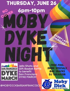 MOBY DYKE NIGHT returns Thursday, June 26, 6pm-10pm with Jell-O Shots, gift basket raffle, and community spirit - all supporting the SF Dyke March, plus our monthly discounted drinks, free pool, bar snacks and jams from DJ Tararisin. See you there!