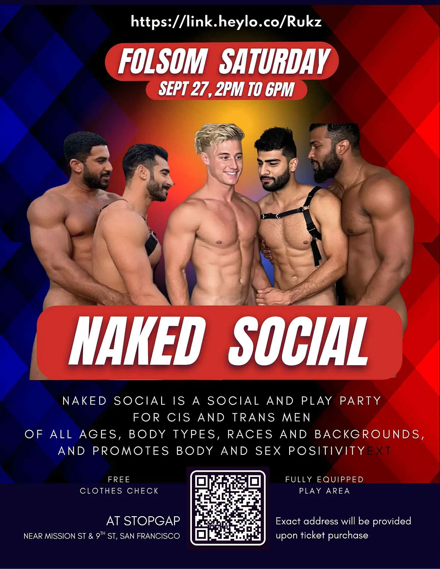 Folsom Saturday N A K E D S O C I A L Saturday, Sept 27, 2pm to 6pm Note: if you’re looking at this event from a different time zone, you’ll see the event time adjusted to your time zone. The event is from 2pm to 6pm PST. Location: STOPGAP, Near Mission Street and 9th Street San Francisco. You can see exact address only after you buy the ticket. The venue is two levels - street level is for free clothes check, getting a beverage, social space, and the basement level is sexy lit play space with play equipment. The basement is not ADA accessible. Tickets: $20 First 20 tickets are Early Bird special price of $20 $25 Next 20 tickets are Discount special price of $25 $30 Next 20 tickets are at a price of $30 $35 Next 20 tickets are at a price of $35 $40 Next 50 tickets are at a price of $40 $45 Tickets are $45 until Sept 26 midnight $50 Day of event price is $50 after Sept 26 midnight. If you cannot afford the ticket price, please DM me and I can work it out with you. NOTAFLOF. Also, if you want to, you can donate any sum that will go directly towards paying for someone’s ticket. This is a cashless event. All tickets will be sold through Heylo. Ticket sales are final. No refunds. . Some rules: 1. This is strictly a nude event. Full nudity is mandatory. Underwear or any clothing is not allowed. Harness cock ring, cock cages are allowed. Shoes are required. 2. Please don’t bring any drinks from outside. No drug usage will be tolerated in the venue. Beverages will be available for purchase at the venue. All credit cards and Apple Pay accepted. 3. The venue has a strict policy of not allowing silicone lube. They provide free water based lube. 4. Free clothes check will be available when you enter. Please check in your phones. We would like this to be a phone free space. You may use your phone to buy beverages through Apple Pay, but limit your phone usage only for payment. No pics or videos allowed in the venue. 5. Please carry a valid ID with you. The venue requires you to show them a valid ID. 6. Please do not throw paper towels or any other garbage into the toilets. This may clog the toilets and cause expensive repairs. Please respect the venue. 7. Please be respectful of people’s personal space. Touch only with clear consent. 8. Please get tested for Covid and STIs before you attend so we keep all our friends 9. There is a ride share chat in this group for those of you who can offer a ride or need a ride. 9. This is an event for cis and trans men. We welcome men of all ages, races, ethnicities, body types, shapes and sizes and all backgrounds. We love to see the beauty in diversity. NO REFUNDS. Tickets once purchased cannot be refunded. NON TRANSFERABLE.