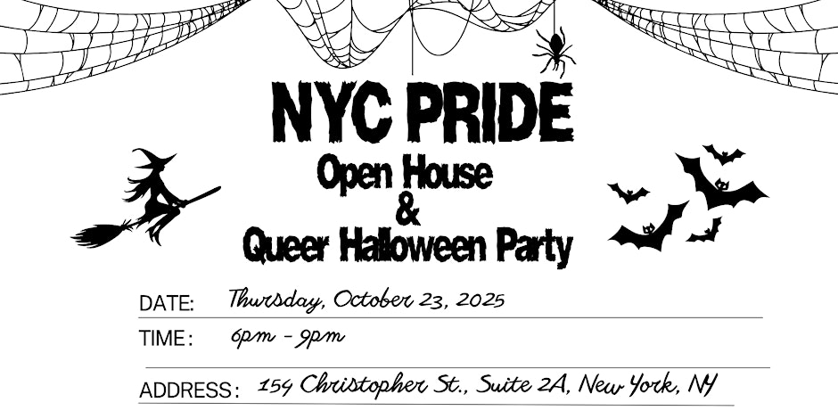 Join us for the 3rd annual NYC Pride Open House & Queer Halloween Party - a night of connection, community, and spooky fun! What to expect: Meet the NYC Pride team and discover ways to volunteer, join committees, and shape the future of Pride Costumes encouraged with prizes for best looks! Spooky beats Light bites & refreshments Tabling: If your group would like to host a table to hand out flyers and promote your initiatives at this event, please contact tyler@nycpride.org Donation: NYC Pride Open Houses are free events. A suggested donation of $25 helps keep these events free for the entire community. Thank you for your generosity! Helping with the Open House: The following items (see this list HERE) are needed at the Open House - if you're able to bring an item please indicate it on the RSVP form 10-15 volunteers are needed to help make the Open House a success - please sign up by clicking here and completing the form if you're able to volunteer Questions? Please email tyler@nycpride.org Please note: Please note: All costumes are welcomed as long as they aren’t offensive, rude or bullying in nature to other guests. PLEASE – No offensive or culturally insensitive costumes. No costumes suggesting or promoting illegal narcotics. Toy weapons (or real weapons for that matter) are prohibited
