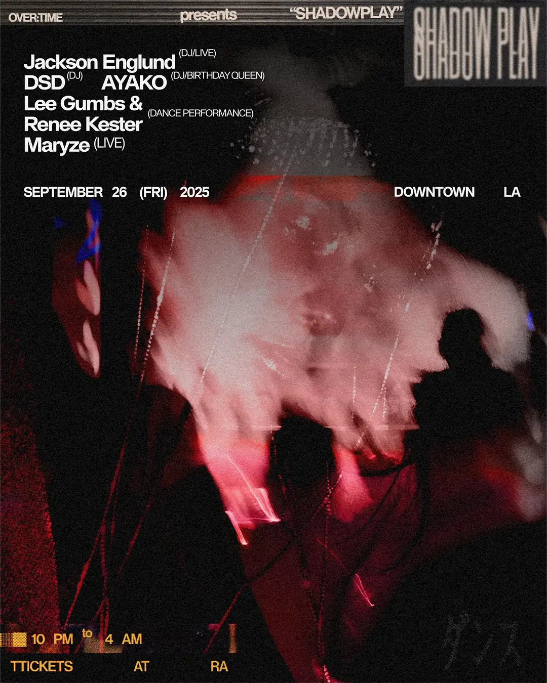 Shadow Play is the stage upon which the story unfolds, melding underground dance music with live performances, theatrical drama, and candlelight. In the lineage of Paradise Garage and The Box, Shadow Play rises as a temple of refuge—where the past and the present collide, and the dance floor becomes a sanctuary for electric connection. “A dim-lit, bass-thick gathering where the walls seemed to hum with anticipation and the crowd moved like they’d been waiting for this exact frequency to drop.” — KALTBLUT Born from countless nights and sunrises, from Tokyo to London, New York to LA — this is our homage to the dancefloor: blending sound, art, movement, and innovation in which the dark and the light move in harmony not opposition. Inspired by the legendary parties that built communities of inclusiveness and love, we carry that spirit forward, creating a space for unity. LINE UP JACKSON ENGLUND (LIVE/DJ) MARYZE (LIVE) AYAKO (DJ) DSD (DJ) LEE GUMBS & RENEE KESTER (DANCE) ***ADDRESS ANNOUNCED DAY OF SHOW VIA TICKET LINK**