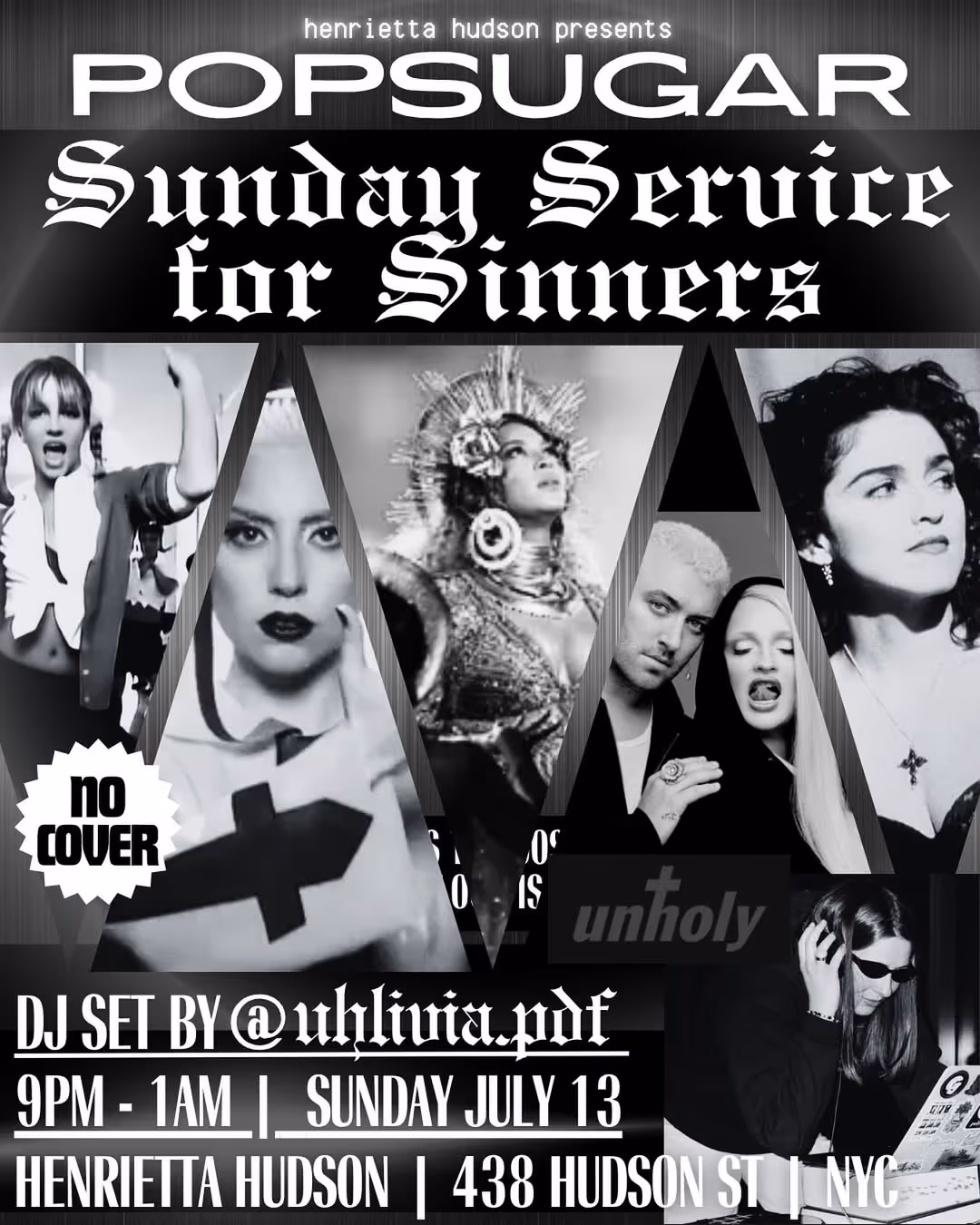An unholy gathering for the church of pop. Pop is the gospel. No cover!