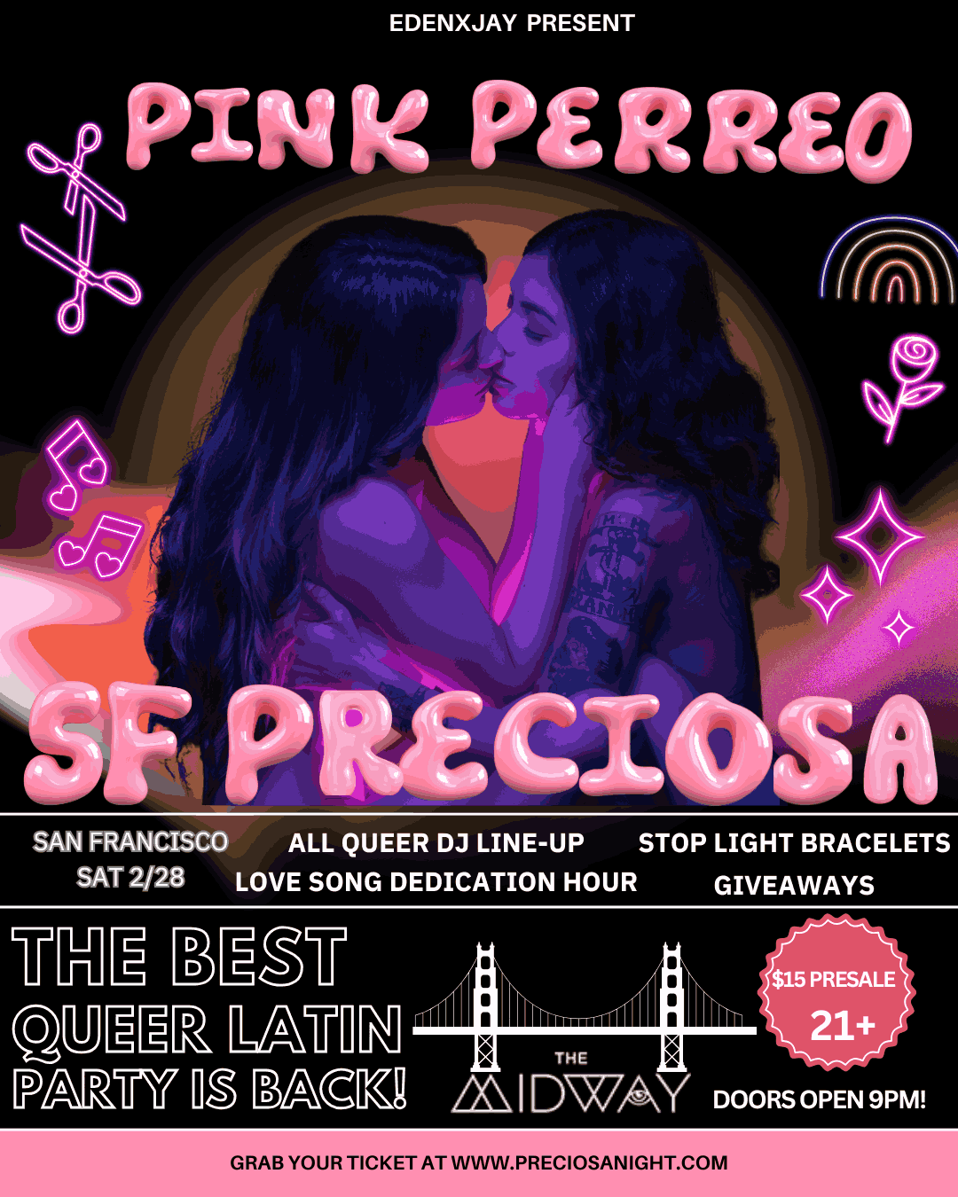 The Preciosas are coming BACK in San Francisco on Saturday, February 28th but this time it's a PINK PERREO PARI! LA's BEST Queer Reggeaton Party is taking over The Midway! Join us for a night filled with Queerness, Community, and non-stop Perreo. The last time we came out, we SOLD OUT! So Grab your Shes, Gays, and Theys for a very special night of Queer performances, Queer DJs, and beautiful vibes all night long. The party starts at 9pm and goes til late. Grab your tix now b4 they sell out! WHAT TO EXPECT: Single Shoutouts Best dressed contest! Surprise Performances Merch giveaway! Y mas! 21+ Event