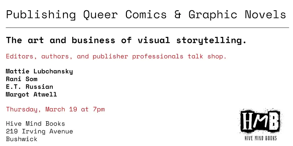 Comics and graphic novelists Mattie Lubchansky, E.T. Russian, and Rani Som, talk with Margot Atwell about visual storytelling Join us at Hive Mind Books in Bushwick for the latest installment in a brand new monthly-ish series Publishing Queer, in which experienced authors and publishing professionals demystify different aspects of the business and answer your questions. This month, graphic novel and comics luminaries Mattie Lubchansky, E.T. Russian, and Rani Som, will talk with Margot Atwell about the many ways queer creators publish their work and approach visual storytelling. Free to attend. Bring your questions! The coffee and tea counter at Hive Mind Books will be open for the duration of the event.