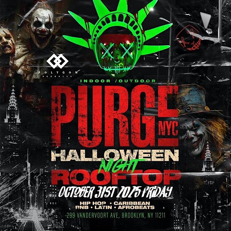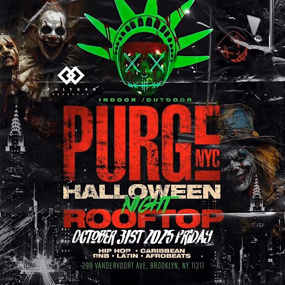 Celebrate Halloween at the Purge Halloween Party at Polygon in BK! Dance all night to Hip Hop, Caribbean and R&B,. Costumes and nonstop vibes! Halloween 2025 Friday Ocotber 31st at Polygon BK 299 Vandervoort Ave, Brooklyn NY Ladies free entry with rsvp before 10:30 pm Men free entry with rsvp before 10:30 pm Playing Hip Hop Caribbean and R&B