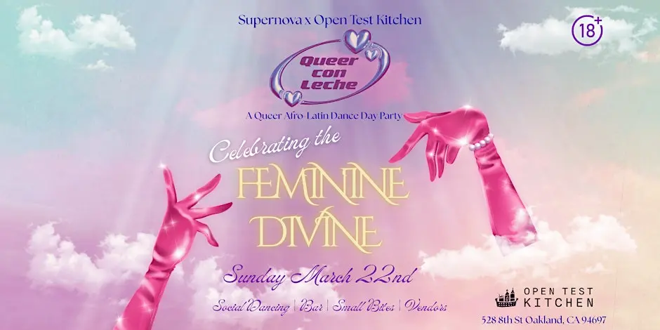 Calling all Bay Area queers 18 and up! QUEER CON LECHE, this month we celebrate the feminine divine, a party for all to hold up our femmes! My fellow dancing queers! This month of Women's History month we want to celebrate the feminine divine in a very gay way! In a party meant for all, we come together to hold up and celebrate our femmes, sapphics, trans sisters, and more, we hope to see you all there regardless of gender or expression. Tap into queer joy on Sunday March 22nd from 12pm to 4pm at Open Test Kitchen and dance until you drop. Calling all March babies! Come celebrate your birthday with us! Message us to get on our guest list along with special perks for you and your friends. We will hold a birthday dance and bring cupcakes to sing you happy birthday!