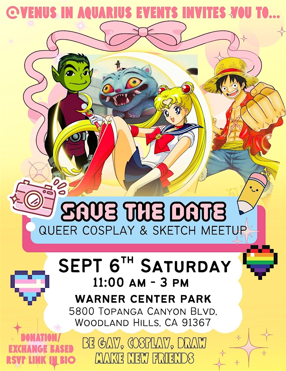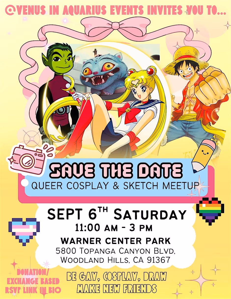 CHOOSE THE "DONATION" GET TICKETS ON EVENTBRITE OR IF YOU ARE SIGNING UP FOR BRINGING FOOD/HELPING OUT/OTHER EXCHANGE INSTEAD OF DONATING MONEY, GO TO THIS LINK HERE https://forms.gle/9D5CcdZhGRhF1FKz9 Queers Connect! Let's do art and dress up! Vegan food potluck! Nature & Cuties🥰 ☀️SEPTEMBER 6th SUNDAY 🌹WARNER CENTER PARK 5800 Topanga Canyon BlvdWoodland Hills, CA 91367 (Exact location posted day of event) ⌚️11AM-3PM Join us for fun games that help us feel less isolated and more connected💞 FOLLOW @VenusInAquariusEvents on Instagram for more details and updates!