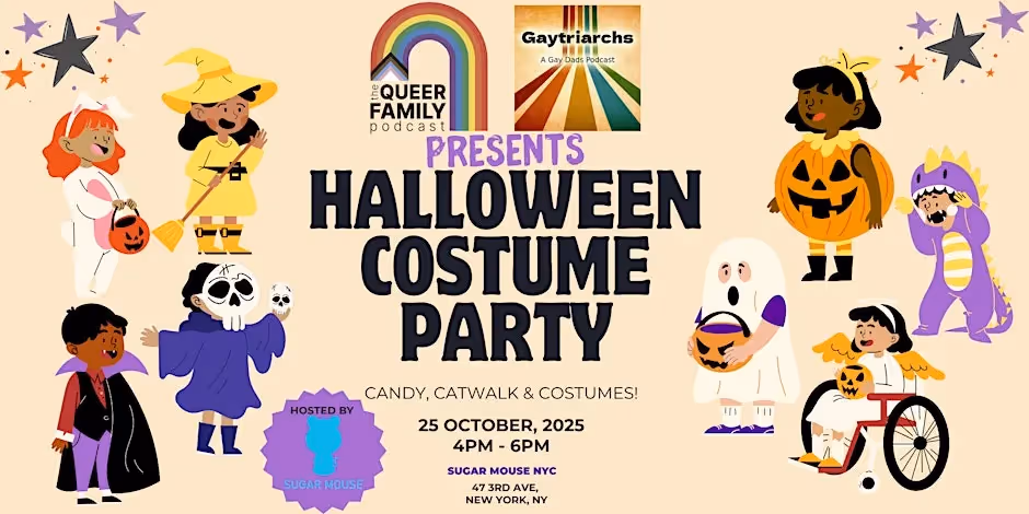 Celebrate Halloween with Your Chosen Family! The Queer Family Podcast & Gaytriarchs are teaming up to throw the ultimate Halloween Costume Party! A space where LGBTQ+ families, friends, and allies can come together for candy, catwalks, and community. Date: Saturday, October 25, 2025 Time: 4 PM – 6 PM Location: Sugar Mouse NYC, 47 3rd Ave, New York, NY Expect a joyful, inclusive event where kids, parents, and chosen family members can dress up, trick-or-treat, and take part in a fabulous costume catwalk. 👻 Costumes encouraged. Laughter guaranteed. All are welcome.