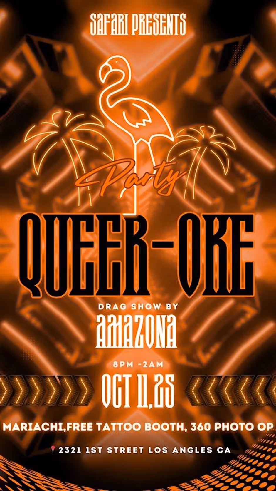We’re Back! Safari Restaurant and Bar is bringing you yet another Night of Queer-oke Tell all your friends or come alone and make new ones! This October edition will welcome back Amazona Dragqueen for 2 very special performances, Luv Marquee to bring you a 360 Photobooth, Allys Ink Tattoo is in the house for FREE pre-made Spooky Art to choose from and a Mariachi to celebrate and close out Hispanic Heritage Month! You do not want to miss everything going on! Join Us cant wait to sing along with you!