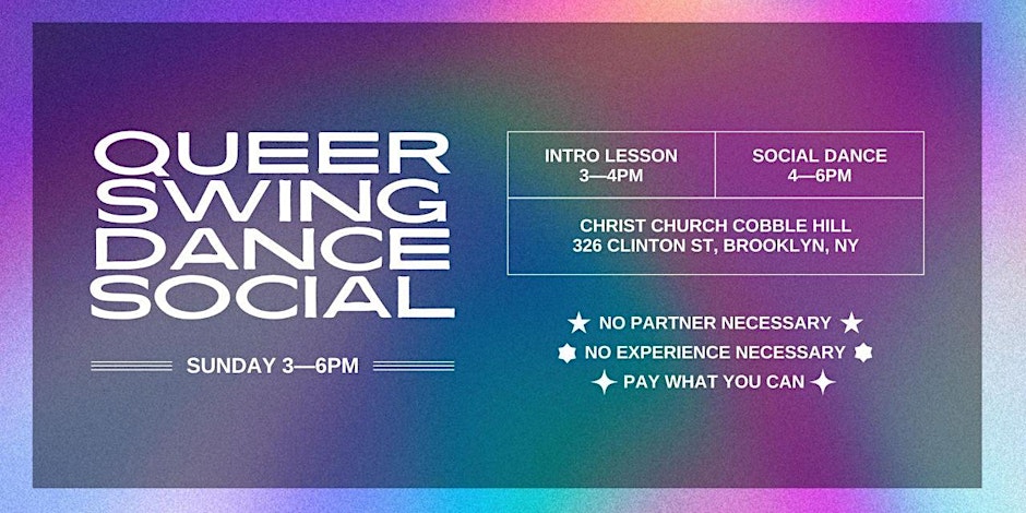 Queer Swing Dance Lesson and Social Dance - first Sunday every month! 3-4pm: Beginner Intro Lesson 4-6pm: QSD Social Dance Christ Church Cobble Hill 326 Clinton St, Brooklyn, NY 11231 No partner or experience necessary *All events are donation based and require masks We keep each other safe 🌈