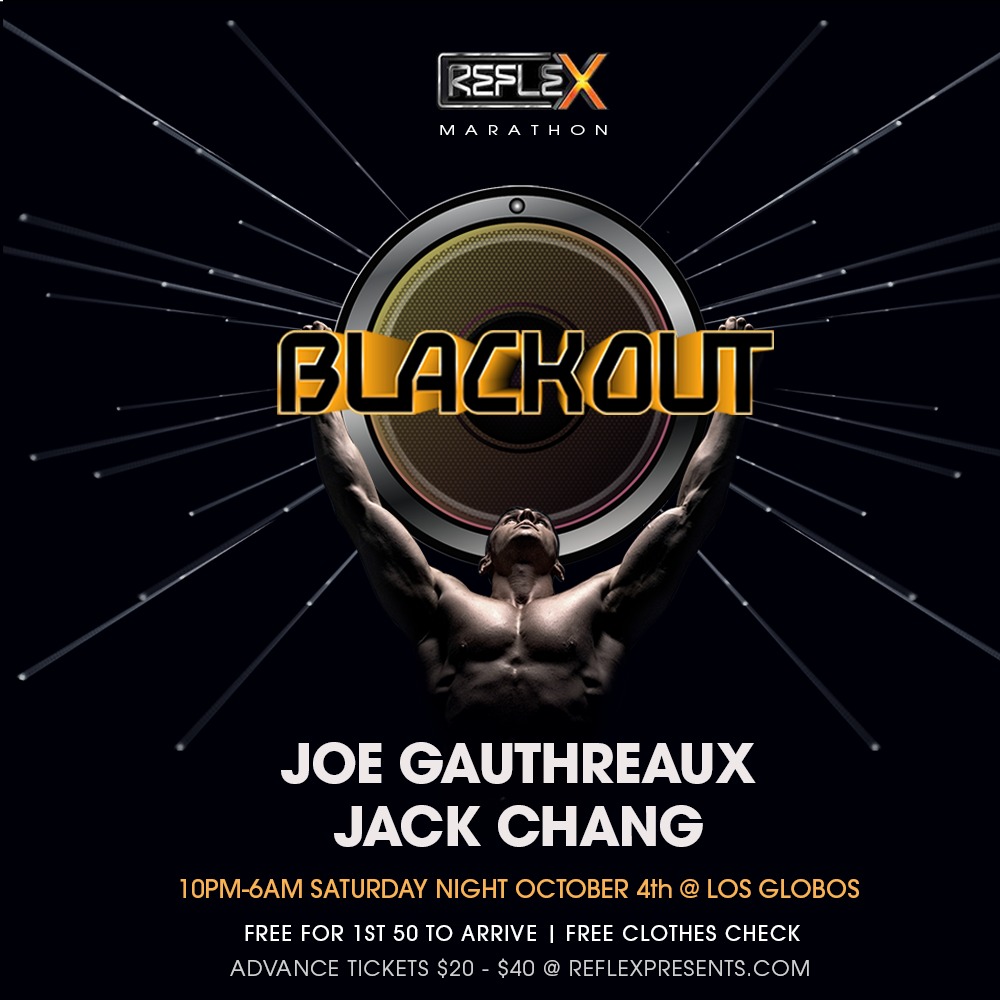 TIER 2: $30 USE PROMO CODE: REFLEX for 10% OFF Reflex presents BLACKOUT an 8-Hour marathon with DJ/Producers JOE GAUTHREAUX (Atlanta) & JACK CHANG (Berlin) Saturday Night Oct. 4th 10PM - 6AM @ Los Globos. I mmediately after the Anjundeep DJ/Producer LANE 8 show at the Greek Theater. Joe & Jack return from our two Biggest evens in October 2022 & 2023. Hosted by Uriel Ramirez & Brian Taylor Kinney delivering Raunchy Reflex Triibal Beats on a BLACL LIT floor full of Hot Men with all the decadence and debauchery you desire.