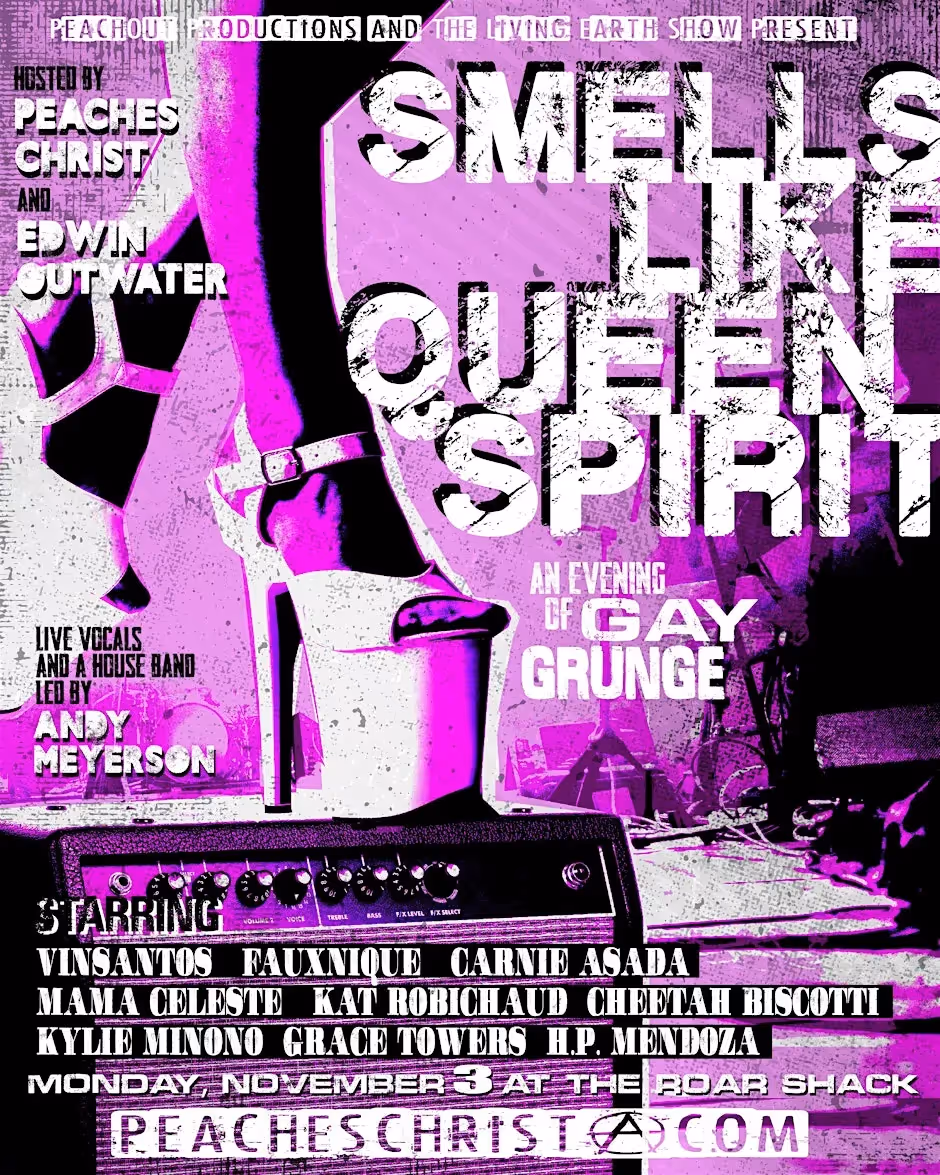 PeachOut Productions is the glamorous lovechild of drag icon Peaches Christ and acclaimed conductor Edwin Outwater—a bold and brilliant collision of high art and high camp. Together, they produce dazzling musical events that fuse the power of live music with the spectacle of drag, variety, and theatrical storytelling. Known for their spectacularly themed shows and unforgettable special guests, PeachOut Productions are joyous, genre-defying celebrations of queer creativity, orchestral grandeur, and showbiz magic. ROCK OUT! is PeachOut Productions' electrifying live music series where symphonic grandeur gives way to gritty guitars and pounding drums. In this high-octane collaboration, Peaches Christ and conductor Edwin Outwater swap orchestras for a live rock band, creating a powerhouse sound that sets the stage for something totally unexpected: drag royalty singing live. Each ROCK OUT! show brings together a dynamic mix of vocalists, featuring legendary drag performers best known for lip-syncing who now step up to the mic and unleash their real voices. From punk to glam, grunge to pop, every volume of ROCK OUT! celebrates queer power and live music with bold originality and raw, unfiltered talent. The debut, ROCK OUT! Volume 1: Punk Pride, exploded onto the stage at San Francisco’s Chan National Queer Arts Center in 2025, fusing queer punk anthems, iconic drag, and musical rebellion into one unforgettable night. The second, ROCK OUT! Volume 2: Smells Like Queen Spirit, will occur at The Roar Shack on November 3.