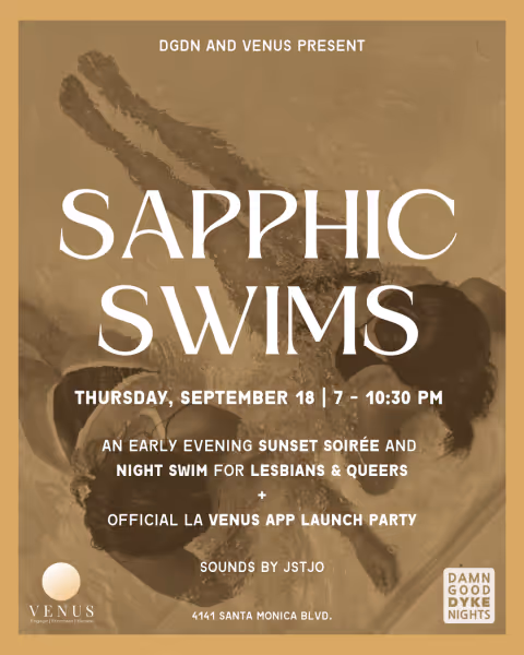 Sapphic Swims returns for an early evening night swim and mixer with our lesbian and queer community on the beautiful pool deck of the Silver Lake Pool & Inn on Thursday, August 21 from 7pm - 10:30pm. Arrive early to enjoy Marco Polo's happy hour from 3-6pm, then come gather, groove and soak in the sunset, while finding and forging community, with tunes by DJ Mari Macha! ✨This month we’re proud to partner with VENUS! Venus is the new private community app created by and for lesbian, queer, sapphic women, and non-binary folks. Not a dating app — just real connection, drama-free vibes, and zero tolerance for trolls. 🌈 Mainstream platforms ban, silence, or exploit us. VENUS sees you!