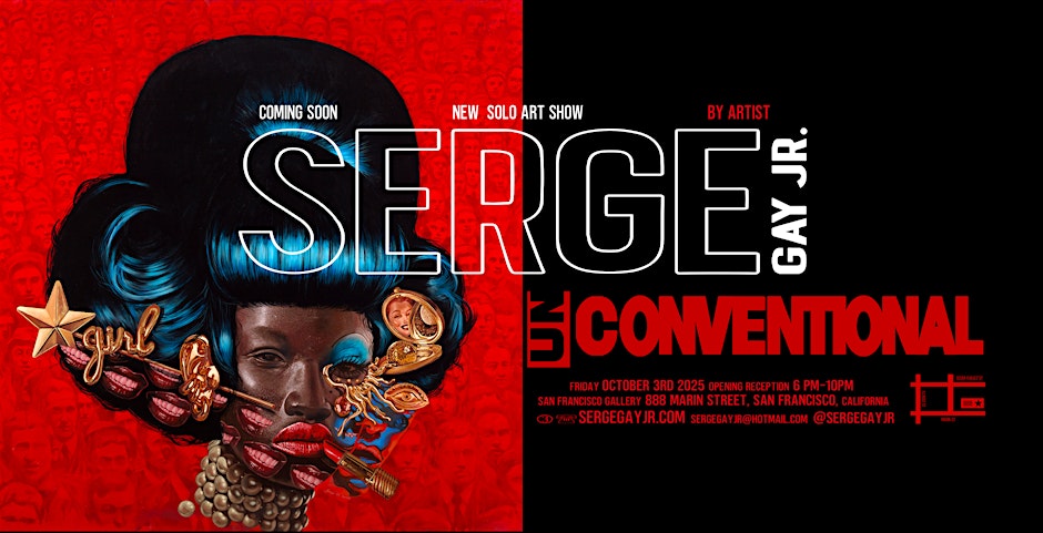UnConventional SERGE GAY JR. NEW SOLO SHOW FRIDAY, OCTOBER 3RD, 2025 sergegayjr.com / sergeshop.com / @sergegayjr About the Exhibition Unconventional is a label applied to something perceived to be outside a set of expectations, which a group often establishes as a means of control or as a result of unchecked groupthink. When conventional, one-track, status quo, or even retrograde thinking dominates society, it cannot move forward with time and evolve to address changing circumstances. Regardless of whether it is about beauty standards, professional expectations, family, or any combination of other life choices, society needs unconventional individuals with the willpower, skill, and confidence to embody new ideas and invent novel ways of doing things; bespoke organic variety, not clone-like copies. This idea even influences our genes and their expression —unconventional variations produce winning designs for a changing environment’s choosing. The best possible version of anyone is an unbridled expression of their unique, impossibly unconventional self. To be unconventional, one needs to act, dress, speak, or otherwise exist as they choose while seeking out and embracing a life aligned with their innate purpose, even if that brings them outside the bounds of cultural expectations. Through these perspectives, we can see that it is more than okay to think and be different; it is fundamental for thoroughly learning about and better understanding anyone, including and especially oneself. Throughout history, including today, the pressure to conform has often been so overwhelming that it has kept our most unconventional selves indoors and out of the spotlight due to genuine, intentionally cultivated fear. The surrealistic imagery in UnConventional highlights scenes and characters expressing their most complete and authentic lives freely, visibly, and defiantly. Serge uses imagery like mirrors, windows, and doors to lead us through stories about freedom, self-reflection on personal truths, seeing outside into a separate, sometimes welcoming, often othering world, and the transitional thresholds between people, places, and perspectives. The show’s format primarily features canvas paintings along with three-dimensional elements. The color medium is acrylic paint, with a core palette of red and blue, accented with orange and yellow. These colors are mindfully integrated throughout the show to create cohesion and highlight thematic aspects among the pieces, including the migrant experience, the power of ownership, individuality, and freedom of expression.