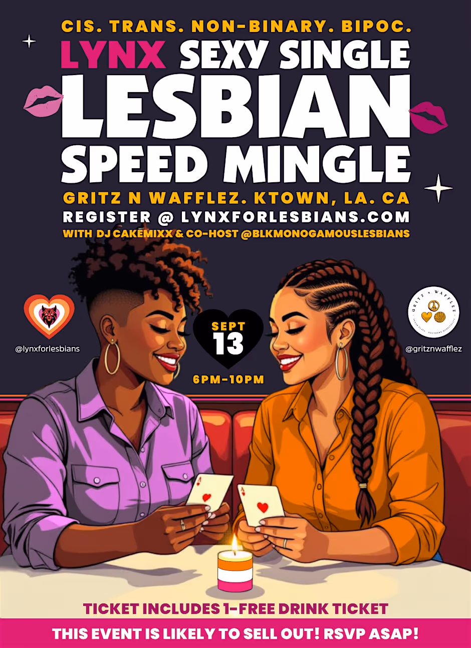Saturday, Sept 13th @ 6pm - 10pm / Gritz N Wafflez, Koreatown, LA Lez Mingle! …Again!Next-next Saturday the Black Lesbian-Owned Dining Hot Spot: Gritz N Wafflez w/ DJ Cakemixx. Selling out fast! @ https://lynxforlesbians.com Tickets are $15 & includes 1-FREE drink ticket. 21+ / Free parking also available. The LYNX for Lesbians in collaboration with Monogamous Black Lesbians presents Sexy Single Speed Mingle night; a private BIPOC-organized and focused speed mingling event embracing womxn, butches, femme and masc trans, two-spirit, non-binary, and all gender expansive members of the lesbian community hosted in Los Angeles, CA (Koreatown) @ the Black Lesbian-Owned Dining Hot Spot: Gritz N Wafflez w/ DJ Cakemixx. Whether you're looking for platonic, romantic, professional, and/or otherwise partnerships, it's going to be a night filled with fun and intimate connections that are sure to last a lifetime.. Live & in-person!!! in Koreatown (LA). Get some no-pressure, one-on-one face-time with wonderful lesbians that love your pride and are interested in what you're into.