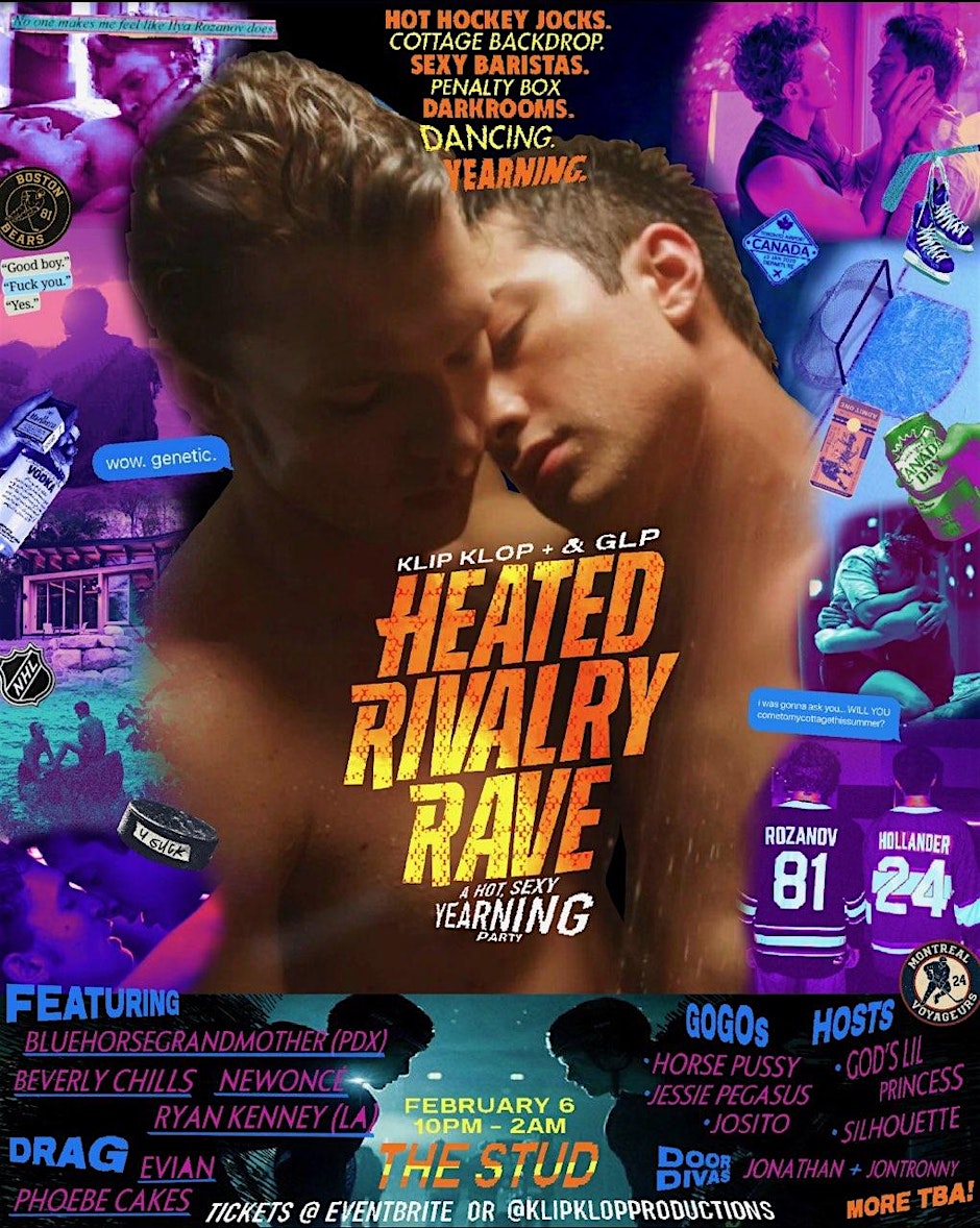 21+ • SEXY BARISTAS • HOT HOCKEY JOCKS • COTTAGE BACKDROP • PENALTY BOX DARKROOMS • DANCING/YEARNING Taking a break from the horny tears to announce we will be yearning and dancing together on February 6! The Heated Rivalry Rave is a late-night, sweat-slicked queer dance party inspired by hockey boys, extra bananas, baristas, ginger ale, locker-room tension, and the kind of longing that lingers just a little too long. We're obsessed and cannot wait to share the dance floor and love of Heated Rivalry and make some hot steamy memories! Secure your ticket (link in bio) today, my little tuna melts!