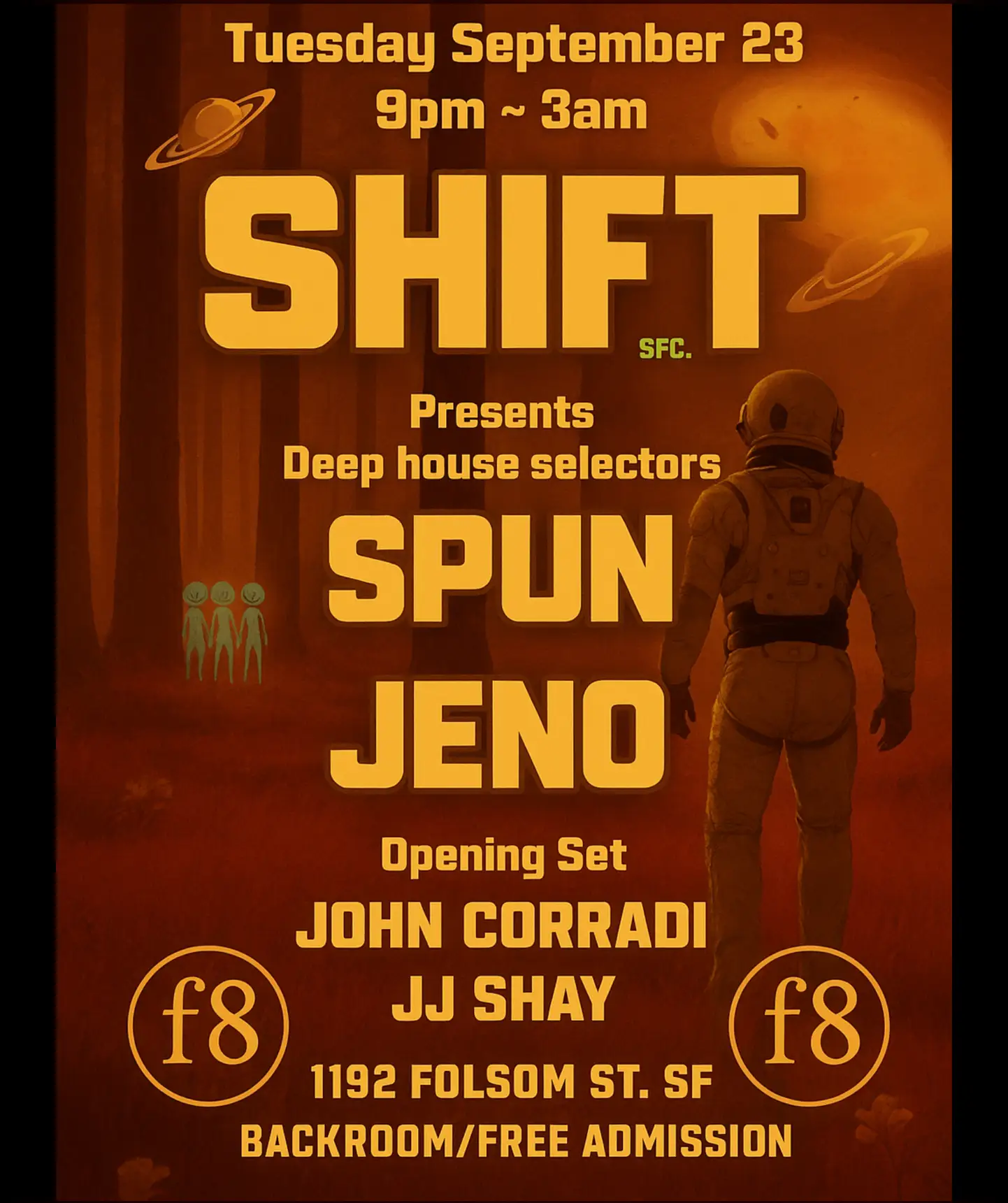 SHIFT – September Edition We’re back this month with the next installment of SHIFT! Monday, September 23rd This month’s special guest DJs: Spun (Rong Music, NY → SF) Jenö (Wicked, The Void – SF) Holding down the early vibes are our residents: JJ Shay & John Corradi We’ll also be celebrating Mr. Shay’s birthday in proper rave-cave style Club F8 – Back Room (The Rave Cave) Free Admission Come dance, celebrate, and keep the vibe alive with us!