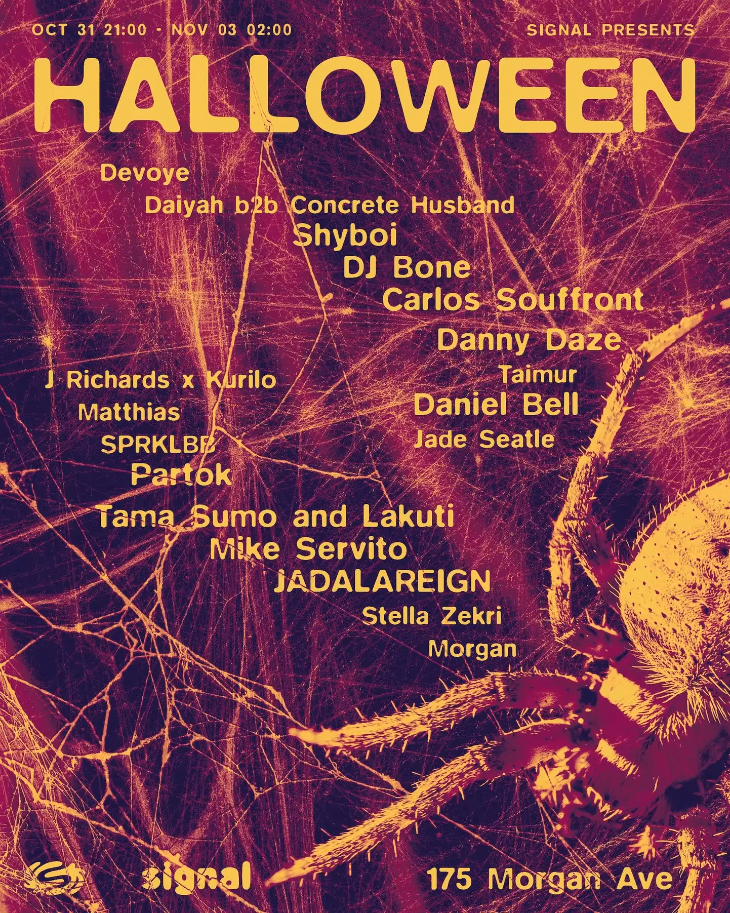 Signal inaugurates its first Halloween with an uninterrupted 60-hour marathon, running from 9PM on October 31 until 2AM on November 3. Across three extended segments, the weekend traces a continuous arc of rhythm and atmosphere, moving from opening tension into long-form hypnosis and closing in collective release. Friday into Saturday opens with Devoye setting the floor before Daiyah and Concrete Husband combine for a midnight back-to-back. Shyboi drives the room into darker territory, leading into a sunrise handover to Detroit mainstay DJ Bone, whose uncompromising, high-velocity style defines the first transition into daylight. Saturday into Sunday begins with Carlos Souffront, known for his meticulous approach to long-form blends, followed by the wide-ranging palette of Danny Daze. As evening falls, Taimur and Daniel Bell refine the energy into stripped minimalism and tight, functional grooves. The night continues with Jade Seatle, a driving back-to-back from J. Richards x Kurilo, and Matthias carrying the floor into sunrise once more. Sunday into Monday spans the final arc. SPRKLBB and Partok set the tone, leading into the central back-to-back of Tama Sumo & Lakuti, whose sets are rooted in connection and warmth. The evening resumes with Detroit’s Mike Servito, followed by JADALAREIGN and Stella Zekri, before Morgan takes the closing stretch through the last hours until dawn. Three days, three segments, and one room held continuously: Signal’s Halloween marathon marks both an opening statement for the new East Williamsburg club and a test of endurance for dancers and DJs alike. ⸻ Timetable Friday into Saturday 21:00–00:00 Devoye 00:00–02:00 Daiyah b2b Concrete Husband 02:00–04:00 Shyboi 04:00–08:00 DJ Bone Saturday into Sunday 08:00–14:00 Carlos Souffront 14:00–20:00 Danny Daze 20:00–22:00 Taimur 22:00–01:00 Daniel Bell 01:00–03:00 Jade Seatle 03:00–06:00 J. Richards x Kurilo 06:00–09:00 Matthias Sunday into Monday 09:00–12:00 SPRKLBB 12:00–14:00 Partok 14:00–18:00 Tama Sumo & Lakuti 18:00–20:00 Mike Servito 20:00–22:00 JADALAREIGN 22:00–00:00 Stella Zekri 00:00–02:00 Morgan