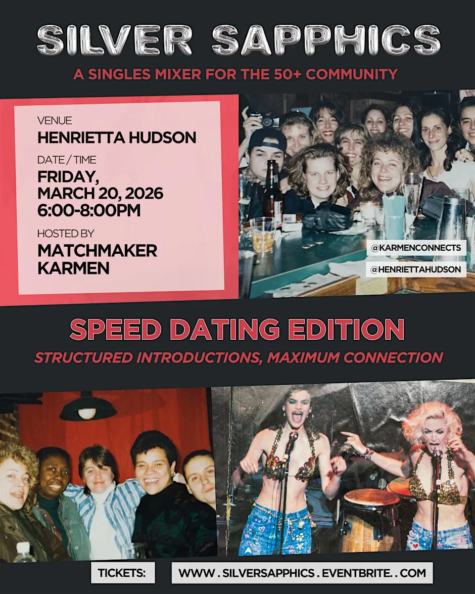 NYC's Premiere Party for lesbians, bi women, and sapphic trans people over the age of 50; this time, with a speed dating twist! Hi, Matchmaker Karmen here. We've been having such a good time at the Silver Sapphics events, we're keeping it going! If you're a single, sapphic, and open to meeting new people, come to Hen's and bring a friend. We have space in the private back room for mixing and mingling. And don't forget, it's happy hour! Unbeatable prices with the loveliest of bartenders. Agenda: 6:00-6:30 pm: Check-In, Mingling 6:30-7:30 pm: Speed Dating 7:30 pm Onward: Open Format What is Speed Dating: Five-minute, one-on-one conversations in succession. You'll be able to indicate romantic, platonic, or non-interest via your smartphone. You'll be able to connect and chat with matches beginning the morning after the event. Why Speed Dating? It's easy to get comfortable in a single conversation for a long time, but there could be matches you're missing! We want to give everyone a chance to meet as many people as possible in a short amount of time.