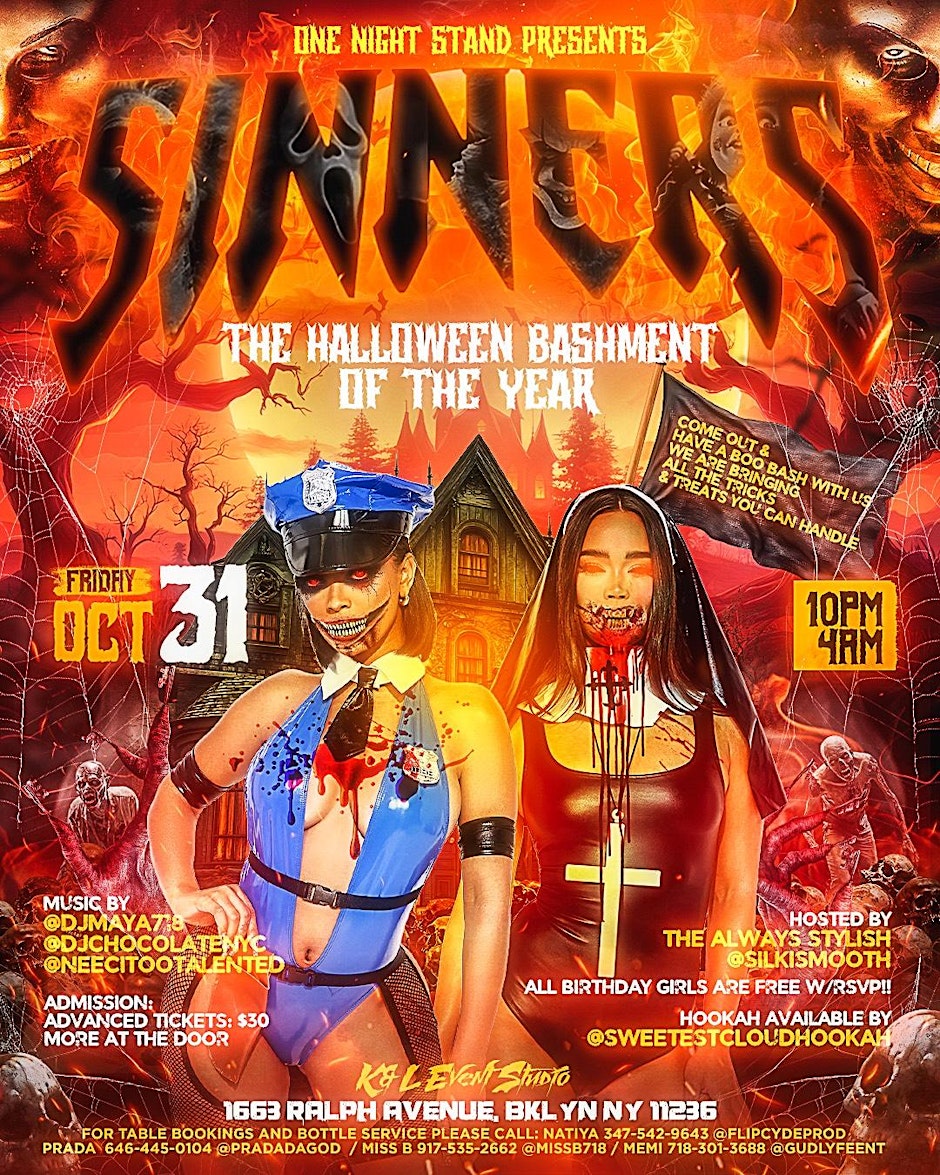 One Night Stand Presents..."Sinners"The Halloween Bashment of the YearDate: Fri Oct 31st, 2025Time: 10 pm to 4amLocation: K&L Event Studio1663 Ralph AvenueBklyn NY 11236Come out and have a Boo Bash with us. We are Bringing All The Tricks & Treats you can handle. Costume contest with prizes Signature drinks Spooky decor Giveaways