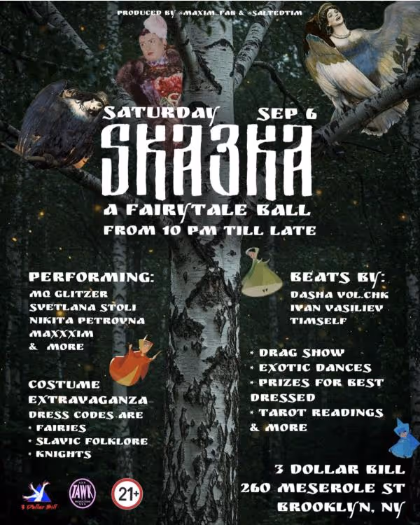 CHAPTER 1 — IN A LAND FAR, FAR AWAY… once just a dream — but on this special night, it becomes your reality. slip into your most extravagant costume, drown yourself in glitter, and step into our twisted fairytale or, as it’s known in the east- SKAЗKA! we’re here to give you your happily ever after — and oh baby, it’s gonna last. 🫦 ✨ enchanted creatures, cursed kisses, royal chaos — welcome to the beginning of our story. 🪩 dance the night away with our DJs, and get mesmerized by our performers Maxxxim, Svetlana Stoli, Nikita Petrovna, MQ Glitzer all the way from Miami and many other special guests (and don’t forget the Go-Go’s) 🧚🏻♂️ fantasy is mandatory. reality? left at the door. september 6 at 3 dollar bill 260 meserole st., brooklyn, ny sat. sep. 6th 10:00-4:00 see you later fairies, xoxo