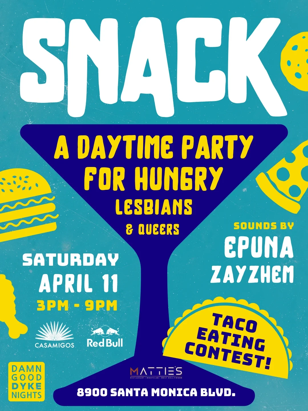 A DAYTIME PARTY FOR HUNGRY LESBIANS & QUEERS! Damn Good Dyke Night's daytime kiki returns at a brand new venue on Saturday, April 11 from 3pm - 9pm! Join us in the heart of West Hollywood at Mattie's (formally Rocco's) for a grand ol' munch fest with our lesbian and queer community! Spring is here and we're excited to kick things off in the CENTER of West Hollywood at Mattie's! Arrive early to grab a seat on their large corner outdoor deck (perfect for people watching), enjoy some delicious grub off of Mattie's full kitchen food menu, and kick off your afternoon with bottomless mimosas during our Mimosa Power Hour from 3-4pm. Enter our TACO EATING CONTEST for a chance to win tickets to see MUNA in concert on May 8 or 9 at the Shrine Expo Hall! Be the first to fully finish 8 street tacos and you're a winner! Vegan options available. Contest to occur at 6pm. SIGN UP INFO COMING SOON. (limited spots available) Coming solo? Slide into our solo SNACK mixer! Head to side bar where we'll have name tags, games, and plenty of chances to make a cute connection. Join us for drinks, bites, and daytime beats by DJs Epuna and ZayZhem, while we dance and frolic the day away with our lesbian and queer community!