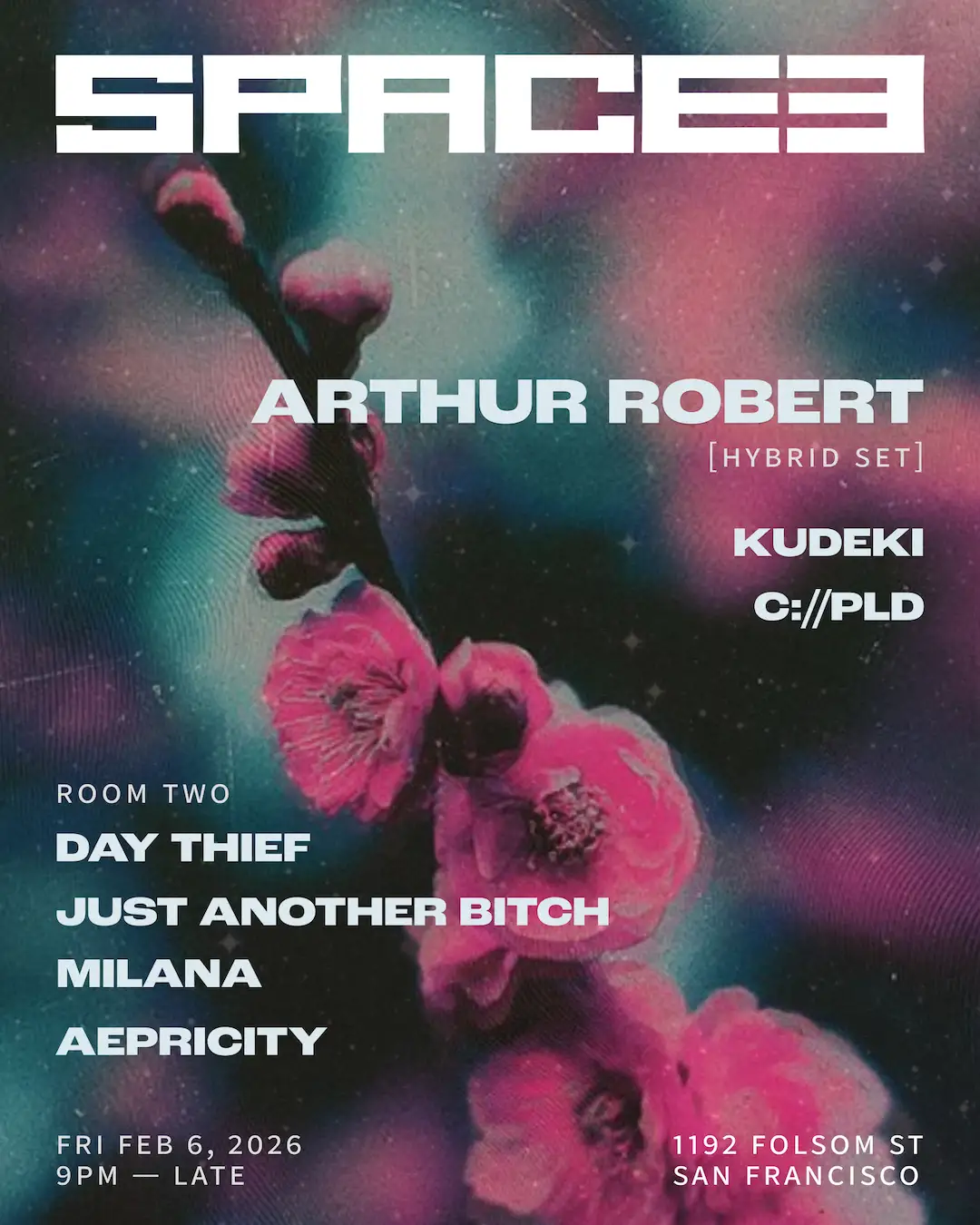 Space Three welcomes Arthur Robert for a 3-hour hybrid set, delivering live techno production in concert with the decks. He has brought his emotive, ethereal, and dancefloor-focused sound to rooms like Berghain, Tresor, and Bassiani, with releases on Token Records, Figure, and Planet X. Distinguished by a percussive edge, his catalog carries subtle touches of jungle and breaks influence. If you know Bay Area techno, you know Kudeki. Equal parts curator and performer, she has spent the last decade cultivating the darker side of the Bay Area’s dance music scene. Her event series, Endzeit, focused on long-form techno in unique spaces, has quickly become one of California’s most compelling gatherings. C://PLD anchors the main room with deep, scene-setting selections inspired by years of exploring global techno communities and supporting artists like GiGi FM, Carlos Souffront, and Shaun J. Wright. Room Two, curated by SutroFM and BOOF resident just another bitch, adds queer and feminine flair with The Ever Afters Campout organizer Day Thief, ‘the void’ visual artist MILANA, and SutroFM contributor Aepricity.