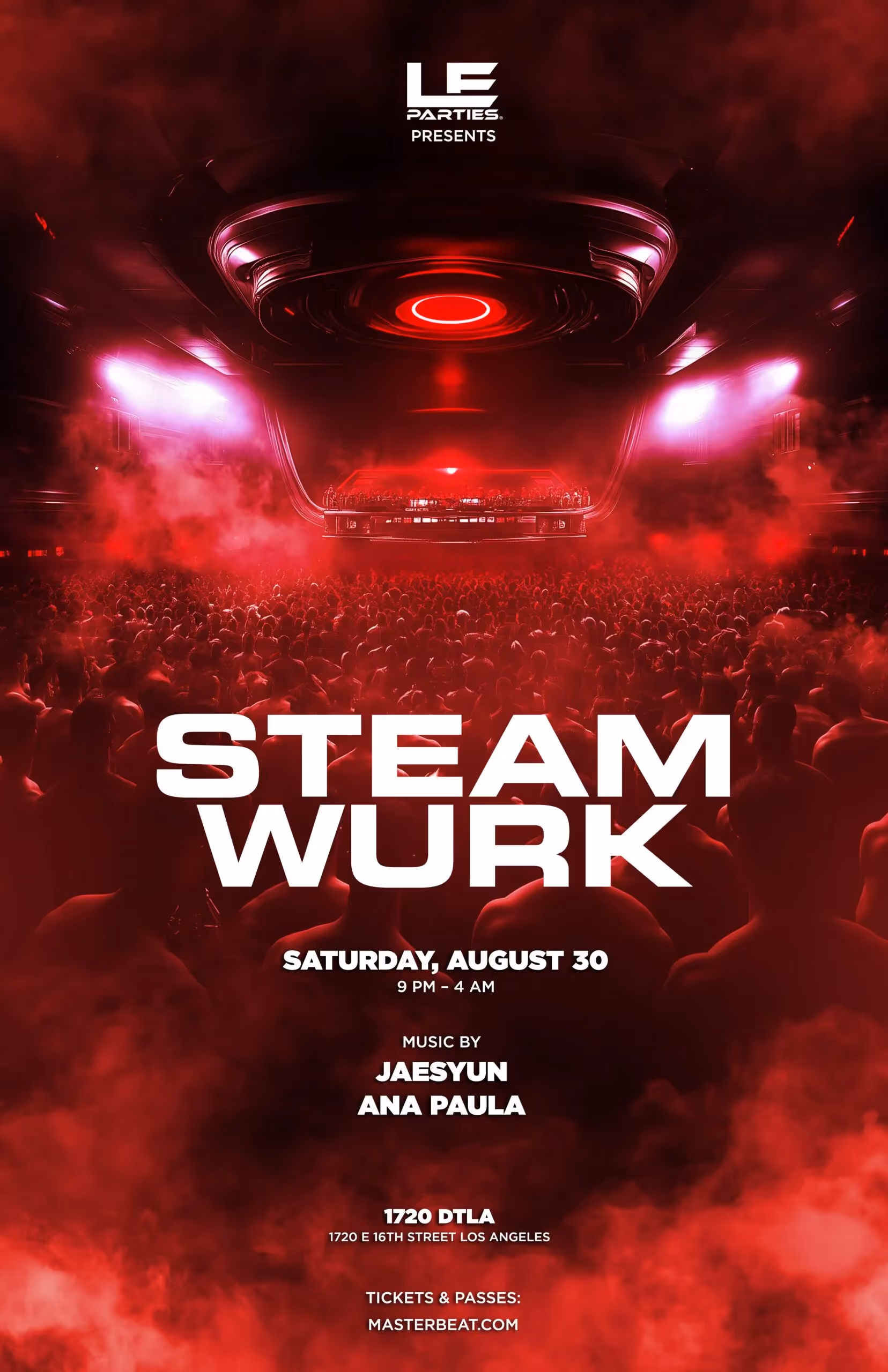 Join LE Parties for an all new Labor Day Saturday night main event at Warehouse 1720 LA, come experience the STEAM and then wurk it at this incredible warehouse space in DTLA with music by Jaesyun & international superstar Ana Paula.