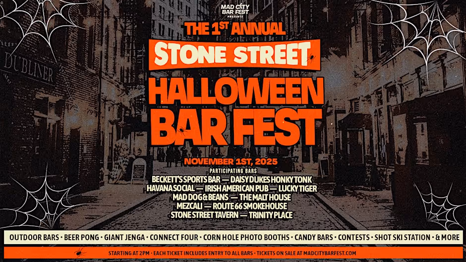 Mad City Bar Fest Presents the First Annual Stone Street Halloween Bar Fest! Join us at Stone Street's most popular bars. Experience outdoor bars, games, photo booths, boozy activations like shot ski stations and pickle back bars, and so much more! Check in to the bar you purchased a ticket to and receive a wristband that grants you access to all participating bars & drink specials! The bar fest is from 2-8pm. COSTUMES ENCOURAGED. Your wristband will provide access to the following bars: Daisy Dukes Honky Tonk (47 Stone Street) Beckett’s Sports Bar (81 Pearl Street) Stone Street Tavern (52 Stone Street) Havana Social (45 Stone Street) Route 66 Smokehouse (79 Pearl Street) The Malt House (9 Maiden Lane) Mezcali (83 Maiden Lane) Irish American Pub (17 John Street) Trinity Place (115 Broadway) Mad Dog and Beans (83 Pearl Street) Lucky Tiger (66 Pearl Street) Ticket does not guarantee entry to bars that are over capacity. Each bar has the right to refuse entry to any patron. Bars subject to change. This event is 21+. NO REFUNDS - ALL SALES FINAL.