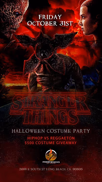 🔥 Stranger Things 🔥 Halloween Costume Party $500 Best Costume Giveway! - Los Angeles' Hottest 18+ Event! The Ultimate Night of Reggaeton & Hiphop Party The Hottest DJ Lineup Spinning the Best of Reggaeton , Latin Beats & Hiphop Drink Specials All Night Long ! 18+ to Enter | Don't Miss Out on the Biggest Halloween Costume Party in LA ! Secure Your Spot Now - It's Going to Be EPIC! Friday October 31st 9-2am (Doors open at 9pm ) Line Starts At 8 PM 18+ to enter with Government photo I.D. Free Before 10PM with RSVP (21+) $5 Before 9:30pm with RSVP (18+) For bottle service and more info, text
