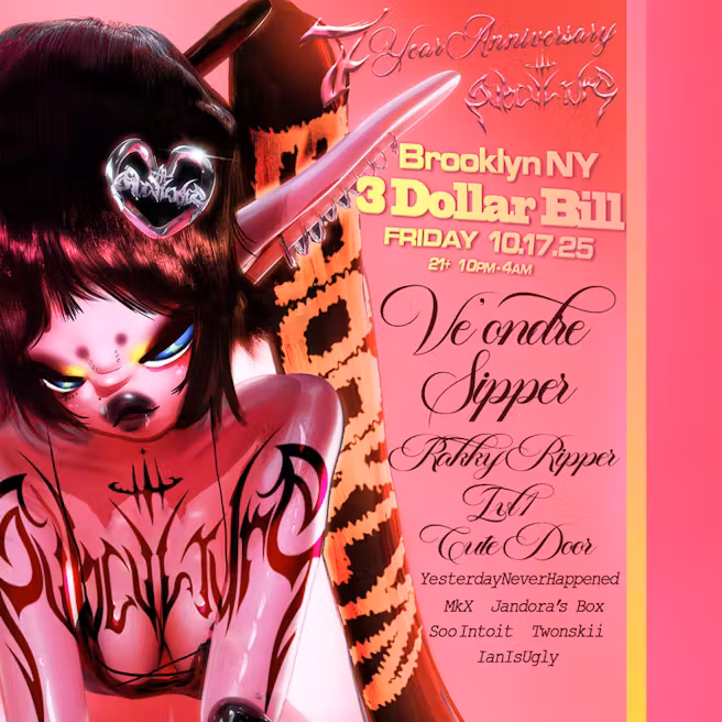 Subculture's 7th Anniversary 777 Tour - Brooklyn NY At 3 Dollar Bill Brooklyn 🎧 Featuring... Ve'ondre, Sipper, Rakky Ripper, LVL1, Cute Door, YesterdayNeverHappened, MkX, Jandora's Box, SooIntoit, Twonskii, and Ianisugly AGES 21+ MUSIC GENRES: Techno, Dance, Electro, Electroclash, Electropop, EDM, Dance, Y2K, Hardcore, Rave & more.