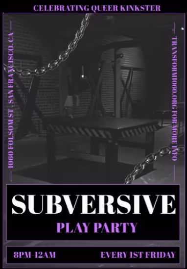 SUBVERSIVE is a monthly queer-centered play party for kinky people of all genders, focused on creating a sex-positive space for folx to be able to explore their kinks in a safe, sane ,and consensual manner. Hosted by Whisper (they/them) and the Transform1060 team Bring your partners or meet new ones every first Friday of the month from 8pm-midnight Must be 18+ THE SPACE INCLUDES: Fully equipped dungeon • Social room • Multiple play areas • A cuddle/quiet room • Complimentary lockers (first come basis) Entry Fee: $25 advance purchase or $30 (cash or credit) at the door per person. Discounted entrance for FTM Munch attendees.