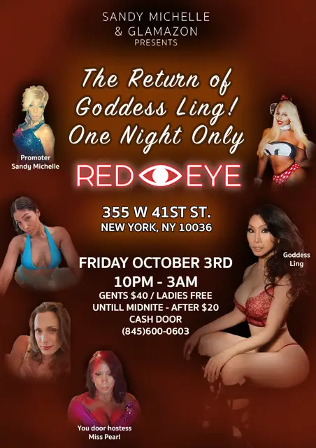 Return of Goddess Ling T-Girl Party One Nite Only Gents 40 – Ladies free till midnite. $20 after. Hosted by Sandy Michelle. Door Lady Miss Pearl.