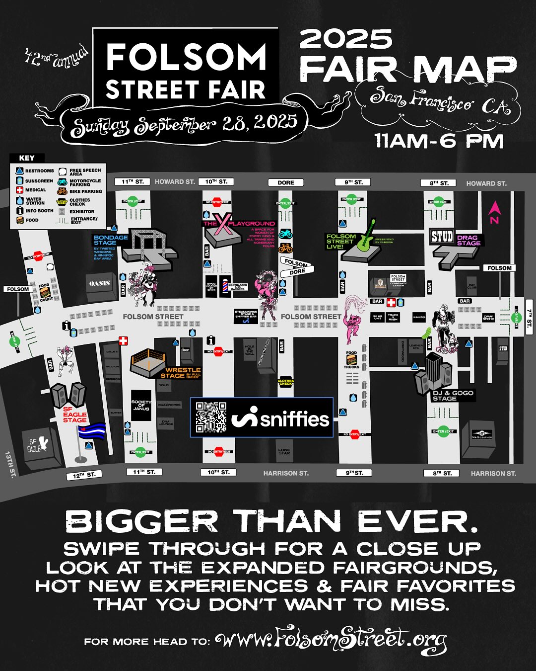 It’s the BIGGEST FOLSOM yet — can you handle it? 🕳️ Nows the time to start planning your Folsom adventure, swipe through for details: 🚍TRANSPORTATION: - Civic Center BART is the closest station. ✅ $10-20 suggested donation- Cash or Cashless tap donations recommended. $2 OFF drinks at our outdoor bars with donation sticker. 📍8 ENTRANCES: - Main Gate hosted by Galactic Camp: FOLSOM at 7th Street - FOLSOM at 12th - CLOSEST TO BONDAGE STAGE: 11th & Howard - CLOSEST TO PLAYGROUND STAGE: Dore & Howard - CLOSEST TO LIVE MUSIC STAGE: 9th & Howard - CLOSEST TO STUD DRAG STAGE: 8th & Howard - CLOSEST TO DJ & GOGO STAGE: 8th & Harrison - CLOSEST TO WRESTLE STAGE: 11th & Harrison - CLOSEST TO THE SF EAGLE STAGE: 12th at Folsom 👖CLOTHES CHECK: - Dore Alley near Powerhouse below Folsom, Sponsored by Leathermen’s Discussion Group. Closes promptly at 6pm. 🏍️ 🚲MOTORCYCLE & BICYCLE PARKING: - Enter at the Dore Alley Gate at Howard. Sponsored by Dykes on Bikes. Closes at 6pm. 💧FREE WATER refill stations. ⛑️Medical Stations - 1286 FOLSOM between 8th & 9th - Folsom & 11th Street 🍔FOOD: Food Court on 12th Street Food Trucks on 9th Street