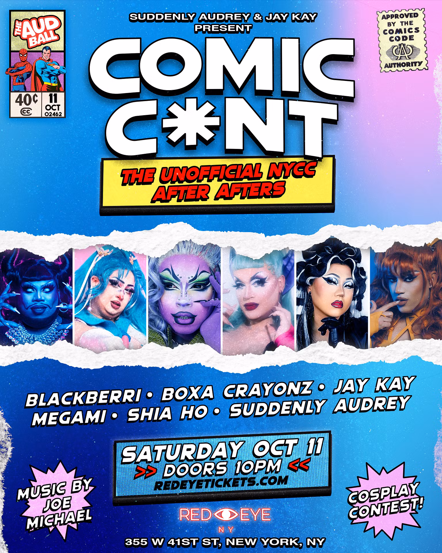 The Aud Ball: Comic C*nt The Unofficial NYCC After Afters! Glam Award–winning producer Suddenly Audrey and Jay Kay (The Boulet Brothers’ Dragula) are cracking open the multiverse for a night of camp, cosplay, and chaos! Expect jaw-dropping performances from RuPaul’s Drag Race star Megami, Dragula’s Blackberri, and NYC nightlife icons Boxa Crayonz and Shia Ho, all set to the beats of DJ Joe Michael.