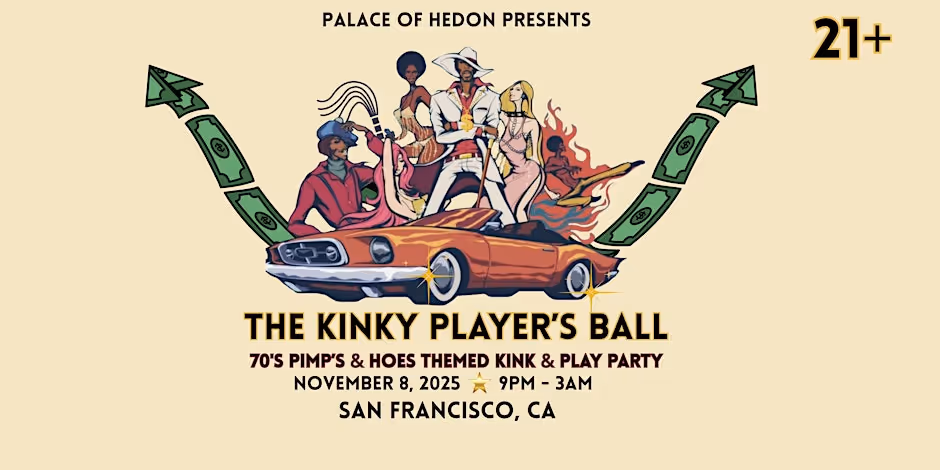 Palace of Hedon presents The Kinky Players Ball, our 70's Pimps & Hoes Birthday Kink & Play Party. A playground for the wildly wicked to unleash their alter ego. The Kinky Players Ball is an event for all the swingers, kinksters, cosplayers, fetish lovers and anyone who enjoys roleplaying. Strut in like you own the night on November 8th, as it will me a night full of fur coats, gold chains, and safe words all under the same roof. Our Birthday kink event is ALWAYS the wildest fall party in the city. Upstairs Orgy Room 2 S** Swings 3 St. Andrews Cross Spanking Bench Dance Floor BYOB (Personal ONLY) DJ: IG @Skniblk Live Kink Performances VETTING FORM FOR INVITATION: https://docs.google.com/forms/d/e/1FAIpQLSdd5c9fYKVDnLtkFXh7aLPBCEhAYHfqbsWkc2HA9zryG3N0FQ/viewform?usp=sf_link DRESS CODE: 70's costumes, 70's Printed Clothing. Club attire, Gowns/Dresses, Leather/Latex, Mesh/fishnet, Lingerie or Gold/Silver Clothing! The more BLING the better! Always welcome: Costumes, leather/latex, masquerade masks, collar/leash, bondage wear. Please come clean and presentable & you can change clothes once you arrive! ATTENDEES: Singles, Couples, K, swingers, Voyeurs, Exhibitions, Cosplayers, Hedonists, Queer Community and All Alike. & If you’ve already attended previous events, you will be emailed our ticket link. WHERE: Located in an exclusive 2 story Social Club in San Francisco, CA. This club has been hosting play parties for 10+ years and has the capacity of 300 guests. This Social club has 1 bathroom, dance floor, upstairs Orgy Room above the dance floor. Plenty of couches for sitting, socializing and lap dances. ADDRESS IS GIVEN WITH YOUR TICKET! MUSIC: Our schedule for music will be R&B/Rap/Twerk Music from the best era, 2000’s & recent hits…. (HOSTING A LAP DANCE CONTEST: 💗) 9pm - 11pm: Player Themed music = 70's - present - Motown/R&B11pm - 12:30: Dance R&B music12am = LAP DANCE CONTEST12:30- 3am = Twerking/RAP/Kinky R&B music (Music you would have sex to) 😍WHAT TO BRING: S** toys, bondage gear, floggers, paddles, leash/collars, hand cuffs, restraints, rope... This is a Kink & Play party, pack off of your TOYS & meet us there.