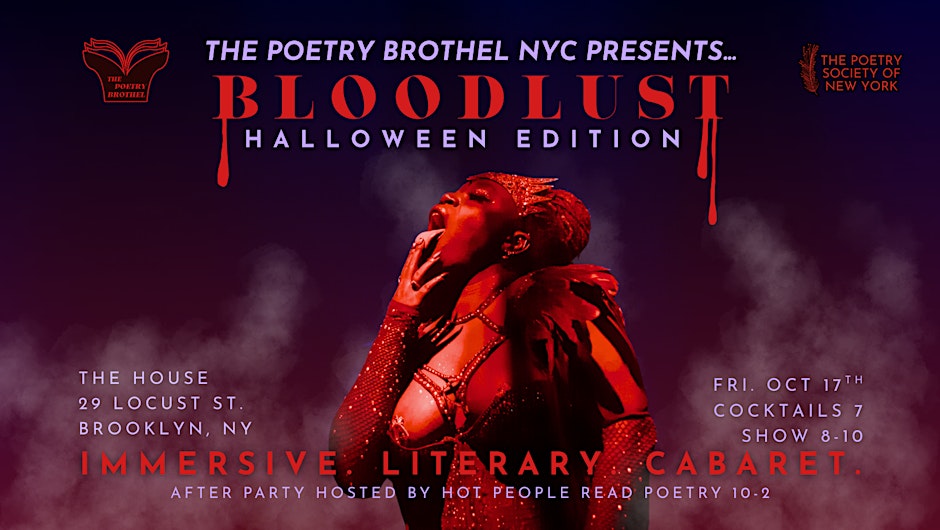 Wet. Red. Dripping. Dangerous. This October, see a show like no other. Where dark desires are revealed by velvet curtains, vampires walk by moonlight, and poetic tension cuts like a knife. The Poetry Brothel’s Halloween special edition: Bloodlust is descending on The House for a night you’ll never forget. Our immersive cabaret features the city’s finest poets, live and and in the flesh reading their own original poetry. Expect verses that are erotic, romantic, philosophical, or even a little provocative. And when the time comes, you choose which poet to invite to the privacy of the boudoir for an intimate, one-on-one poetry reading. To get your heart pumping, we’re also serving up the most intoxicating burlesque, drag, magic, mysticism, and variety performers. A live jazz band weaves it all together like a spell. Expect beautiful and bizarre, a show with touches of classic vaudeville and modern edge. After the show, stay for the after party hosted by Hot People Read Poetry! Expect their hottest poets. A red hot DJ. And hotter than hot experiences from The Poetry Brothel. Dress To Impress Immerse yourself even deeper by coming in costume or character. Red hot velvet, black lace, silk lingerie, vintage fashion, vampiric outfits, fake blood, evening formal wear, leather, and kink accessories are all delectable choices. Need inspiration? Sink your teeth into our mood board (pin.it/5wGkelgq2). What is The Poetry Brothel? The Poetry Brothel is a 17 year running immersive, literary cabaret with chapters across the country - including Los Angeles, Chicago, Denver, and Boston. We are also international, with chapters in London, Amsterdam, Barcelona, and Madrid. However, the New York City chapter is the original group of poets and artists who founded this worldwide phenomenon. We blend poetry and vaudeville, intimacy and immersive, cabaret and activism. Whether you are a poet yourself, a fan of the art, or maybe a lover of theatre, immersive, cabaret, or club culture, this show has something for everyone. We are a collective of artists and poets with a mission to uplift our communities. We honor the sacred tradition of sex work by casting current and former sex workers, sparking conversations to destigmatize sex work, educating our audiences on consent and current issues in sex work, and donating a portion of all profits to GLITS (Gays & Lesbians in a Transgender Society). We hope to foster a safe space for sex workers, our LGBTQIA+ community, and our greater community of artists. Consent is Sexy (and Mandatory) Consent is mandatory and kindness is key. The Poetry Brothel is a no-contact event, here to tickle your mind, heart, and spirit—nothing else! Always ask before touching anyone in our House, and report any discomfort to security, staff, Madam, or Maitre D' without delay. Accessibility This event is only partially wheelchair accessible. The main show and all stage performances are in the main room, which is wheelchair accessible, and has some seating. Private readings and some other experiences will be down a steep flight of stairs. Please contact us if you have any questions. Our show includes flashing lights, reasonably amplified music, and fog machines. Non-alcoholic drinks will be available. Food will not be available. We have a limited number of Pay What You Wish tickets available for those facing financial insecurity. Please reach out to charlotte@poetrysocietyny.org if you have any questions or requests concerning accessibility. Additional Details This event is 21+ with a valid ID. The Poetry Brothel NYC is brought to you by The Poetry Society of New York. Become a PSNY member for access to discounted and/or free tickets to future Poetry Brothel events, and so much more. Learn more at https://poetrysocietyny.org/join.