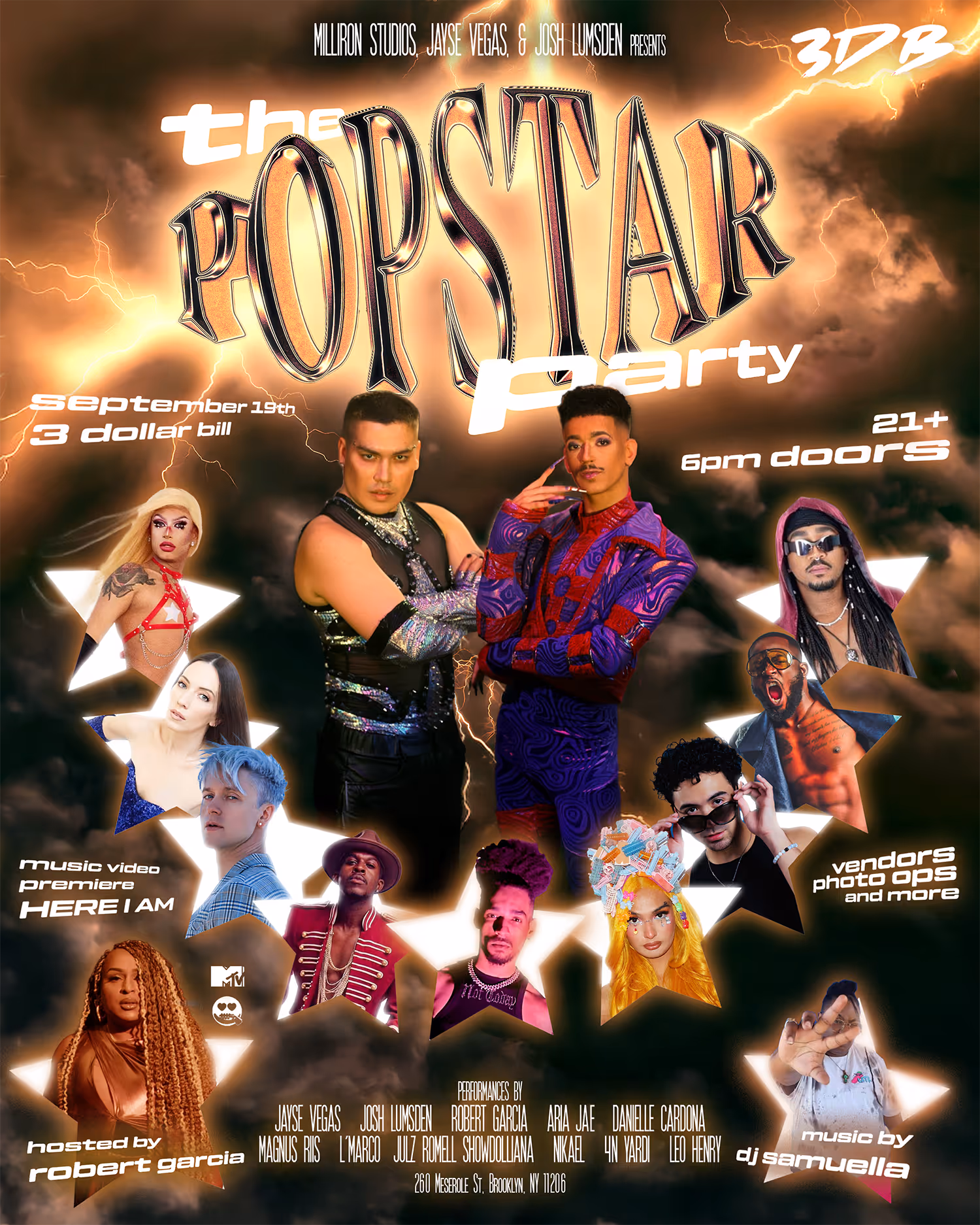 THE POPSTAR PARTY THE (POP)STARS ALIGN, AGAIN, SEPTEMBER 19th!! 6pm-10pm! Fresh off the release of their latest music video for POPSTAR, Jayse Vegas, Josh Lumsden & Milliron Studios are ready to serve you another slice of the fantasy! The multi-dynamic trio are teaming up to bring a production filled evening featuring some of NYC’s hottest local POPSTARS! Truly a night for the queer artists by the queer artists! THE POPSTAR PARTY THEME IS - “HERE I AM: REPRESENTATION MATTERS” Inspired by (and featuring) the visual premiere of HERE I AM by ROBERT GARCIA! Come dressed in your most authentic selves! ALL POPSTARS WELCOME!!! Enjoy - The HERE I AM screening ! Live original music! Live painting installation! Queer owned vendors! Dancing! Drinks! Food! Come support queer art! MUSIC BY DJ SAMUELLA (@dj_samuella) Shows by JAYSE VEGAS (@jaysevegas) JOSH LUMSDEN (@joshlumsdenmusic) ROBERT GARCIA (@beauty_androgyny) ARIA JAE (@arrjaynyc) DANIELLE CARDONA (@danielle_cardona_) MAGNUS RIISE (@magnusriise) L’MARCO (@Imarcomusic) SHOWDOLLIANA (@showdolliana) NIKAEL (@nikaelv) LEO HENRY (@the_leo_henry) 4N YADRI (@officially4n) JULZ ROMELL (@iamjulzromell_)