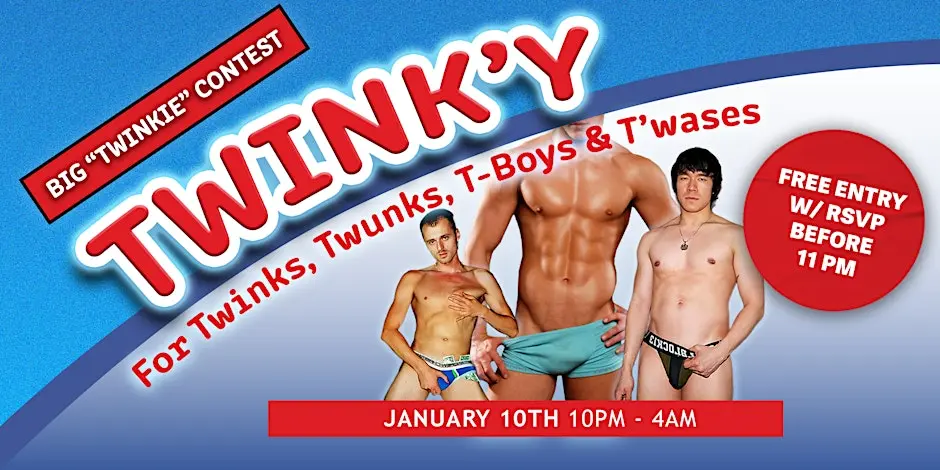 A party for Twinks, Twunks, T-Boys, T'wases & those who admire them! The ultimate BIGGEST TWINKIE (π) CONTEST is finally back! TWINK'Y is a bi-weekly party for Twinks, Twunks, T-Boys, T'wases ("twink that was"), and those who admire them at The Rosemont in Brooklyn.