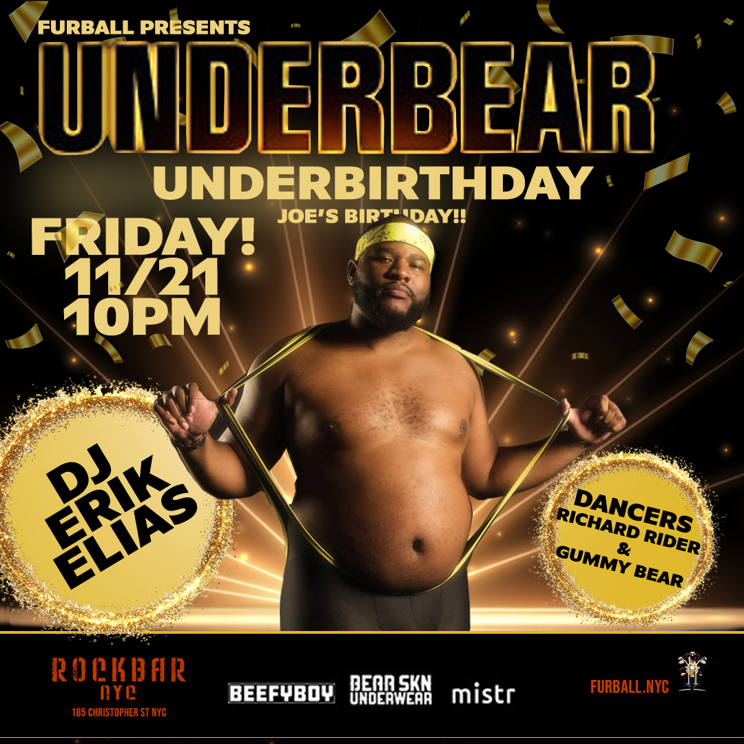 Furball & Joe Fiore Present Underbear Music: Steve Sidewalk 🐷Hot Dancers 😈Hot Music 🐻Hot Guys $10 @ Door Dark Room @ Midnight Hot furry men doing bad things on a Friday night Clothes Check Available ROCKBAR - 185 Christopher St., NYC 21+ Sponsored by Beefyboy, BearSkn, and Mistr