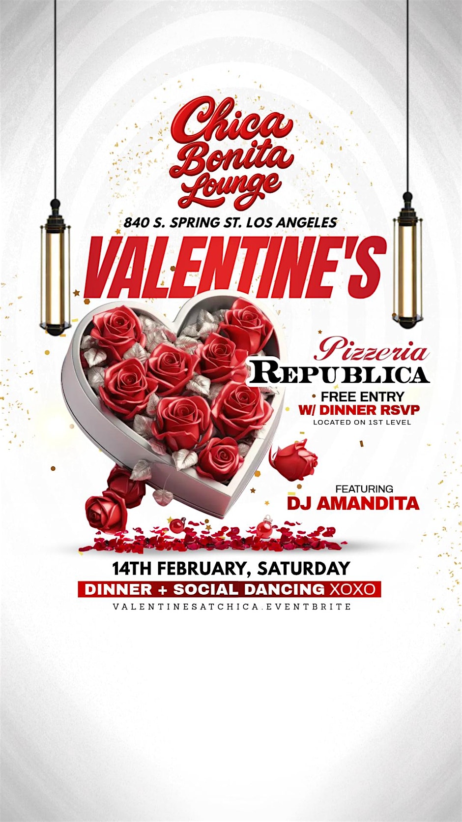 elebrating Love and dancing the night away at Chica Bonita Lounge’s fun Valentines Dinner + Social Dance Party! Valentines Dinner + Social Dance Party at Chica Bonita Lounge LGBTQ+ Get ready for a fun night out at Chica Bonita Lounge LGBTQ+! Join us for a Valentines Dinner followed by an epic Social Dance Party. Whether you're looking to mingle, dance, or just enjoy good vibes and great company, this event's got you covered. Come celebrate love, friendship, and good times. Don't miss out on the best Valentines vibes in DTLA! Dinner Reservation includes GA entries to Chica Bonita Loungefor late night vibes and a dancefloor under the Disco lights!