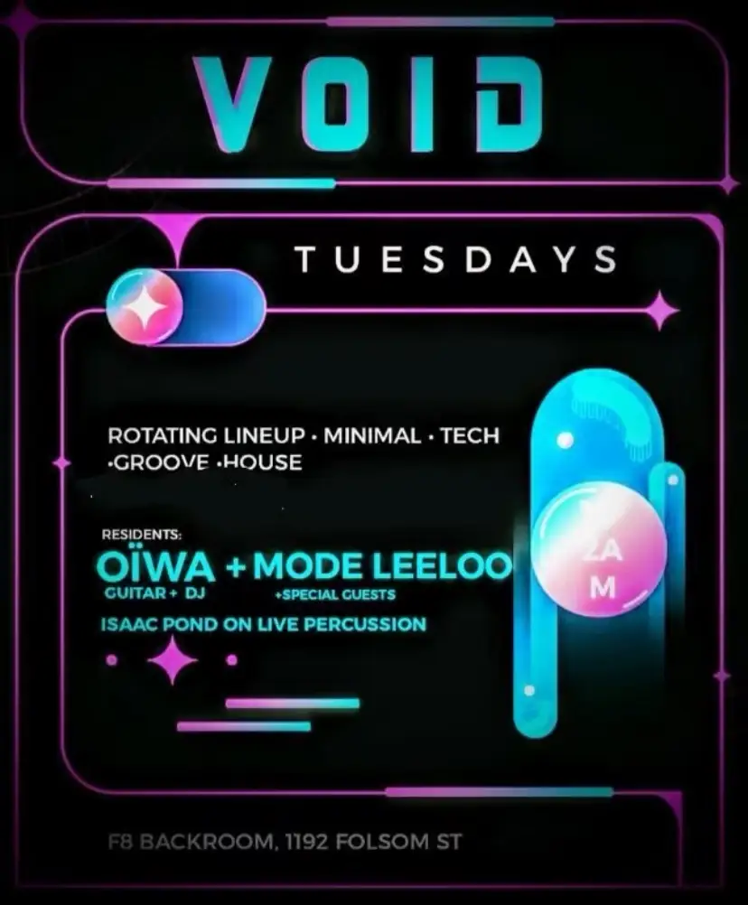VOID Tuesdays We took two weeks off but now we’re back and better than ever. Tuesday is the new Friday, and the F8 Backroom is the place to be. Expect a rotating lineup of minimal, tech, groove, and house with residents OIWA on guitar and DJ, Mode Leeloo, and special guests. Isaac Pond joins on live percussion to take the energy even higher. Join us every Tuesday night at F8 Backroom, 1192 Folsom St. Music until 2AM.