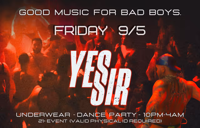 Get ready, Brooklyn! The Mile High City's hottest gay underwear dance party is making its sizzling debut on Friday, Sept 5th @ 9 Bob Note! Join us on the red hot dance floor for YES SIR party and their signature blend of pulsating tech/house beats, irresistible energy, and seriously sexy vibes. Music by: BARE NAKED, James Anthony, & Acid Cowboy (set times TBA) What to expect: A cast of local sexy gogo dancers will be turning up the heat and adding to the already electric atmosphere. Space for self expression and room to sweat! Clothes check is included with your ticket, so slip into your undies, gear, or leather, grab your friends, and come experience the unforgettable energy of Yes Sir. ——————————————— NO REFUNDS *THIS IS A 21 AND OLDER EVENT* VALID PHYSICAL FORM OF ID IS REQUIRED ( NO PHOTOS )