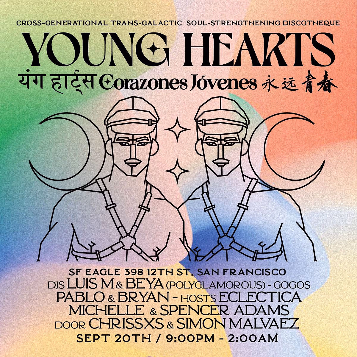A cross-generational trans-galactic soul-strengthening discotheque for all - Young Hearts is rooted in art, disco, classic dance, diversity and sweaty sęxy togetherness on the dance floor. It's time to pass the torch around the dance floor again and celebrate a lovin' life in trying times, come out and run free with us, presented by Nark and Simon Malvaez. Presale Tickets can skip the line! _____________________________ ϾϾϾ FEATURING ϿϿϿ Guest DJ - LUIS M + BEYA (Polyglamorous)
