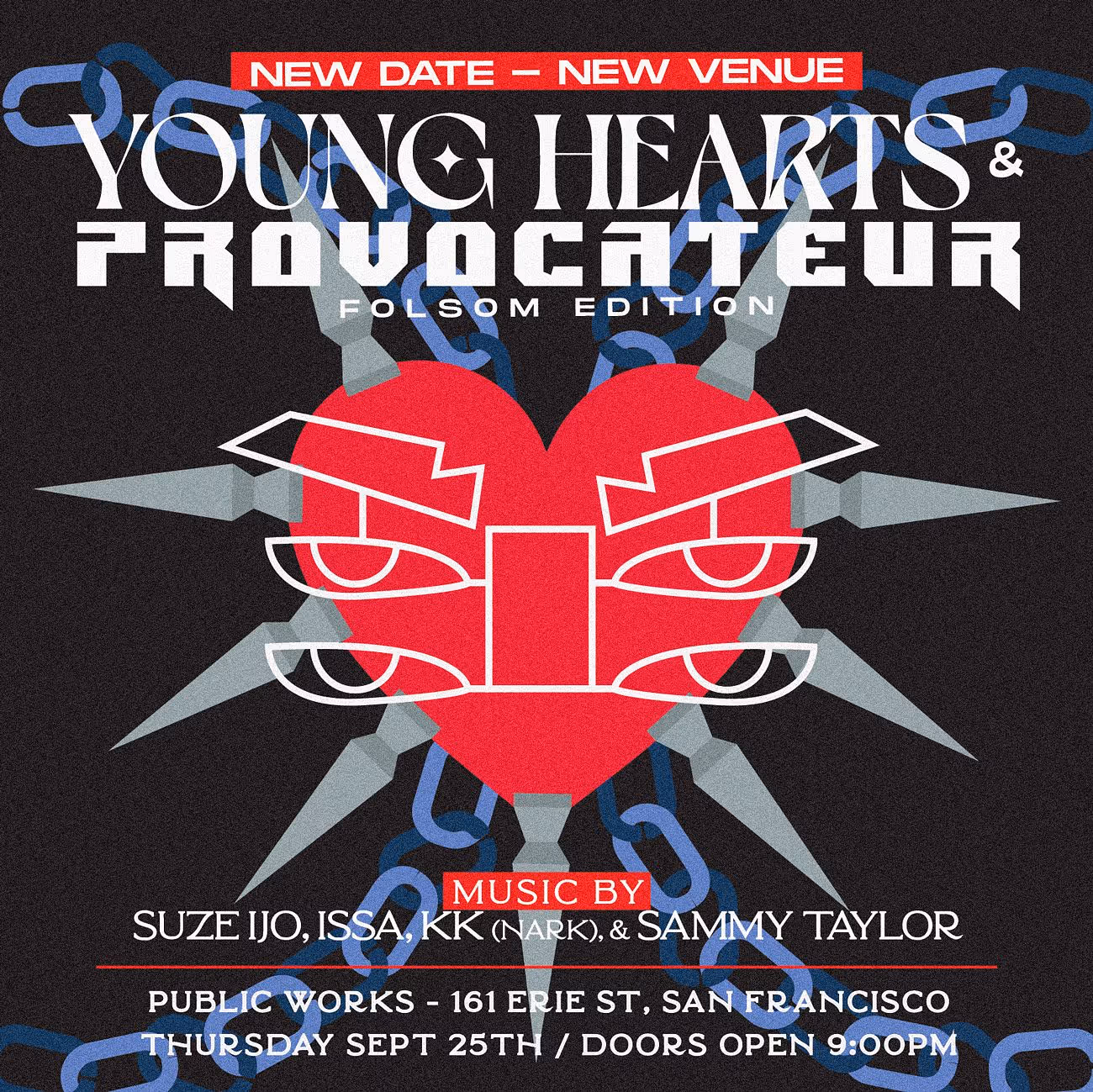 A cross-generational trans-galactic soul-strengthening discotheque for all - Young Hearts is rooted in art, disco, classic dance, diversity and sweaty sęxy togetherness on the dance floor, Provocateur is rooted in techno, pop and freedom of expression. This Folsom Weekend join us in a special safe and private venue for an evening of musical and physical empowerment. Come out and run free with us, presented by KK / Nark + Simon Malvaez + Provocateur. _____________________________ ϾϾϾ FEATURING ϿϿϿ Guest DJ - Suze Ijo KK (Nark, Young Hearts) Issa Sammy Taylor _____________________________ ϾϾϾ HOSTED BY ϿϿϿ SIMON MALVAEZ + JEFFRESON MOSQUERA + HERA WYNN + DWAYNE + ROBERT OK + KAREEM _____________________________ ϾϾϾ GOGO PUPS ϿϿϿ ALLEN + MARIO LUNA Thursday September 25th